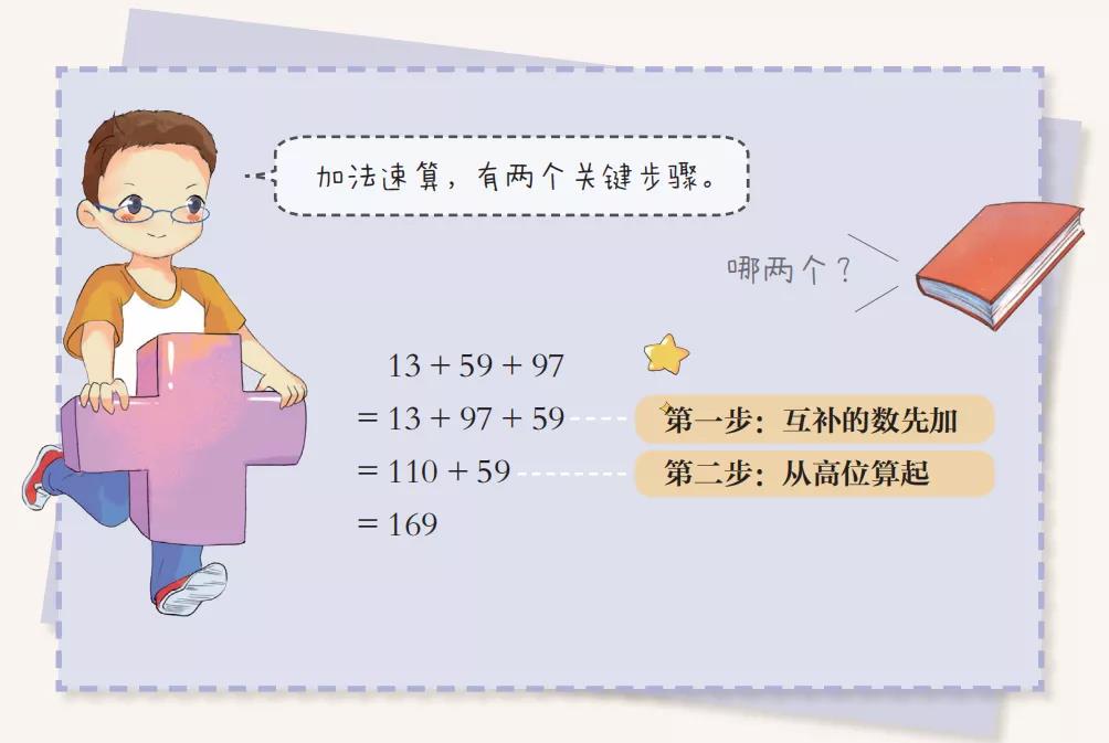 这本书是怎么教孩子学计算的呢?举一例,连加计算13+59+97,教给孩子们两个计算原则。如果算式里有互补的数,先算互补数;如果算式里没有互补的数,可以增加补数,然后先加再减。