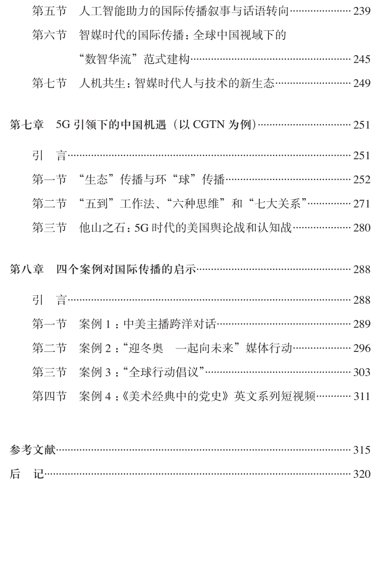 全书共分八章,除了前六章对5G理论体系与国际传播机制进行了全面阐述之外,本书尤为注重实践经验的提炼与转化。最后两章聚焦“5G引领下的中国机遇”与“国际传播经典案例解析”,结合CGTN及中央广播电视总台北美总站的一线实战,深度剖析了我国如何在5G语境下实现传播新突破。这些内容不仅展现了新技术在提升传播效能、构建国家形象方面的实际路径,也为中国在国际舆论场实现“弯道超车”提供了可复用的策略与方法。
