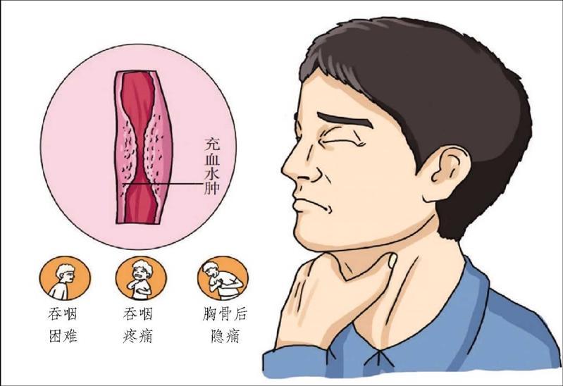 食管内有异物感。食管癌患者会觉得食管里像有东西卡在那儿,感觉食物黏在了食管上,咽不下去,就算不做吞咽动作,这种异物存在的感觉也依然存在。