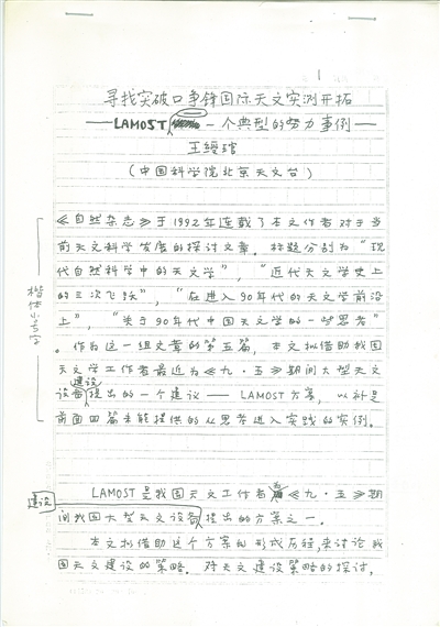 王绶琯《LAMOST——一个典型的努力事例》手稿