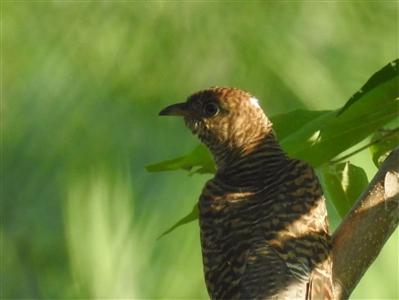 7月26日,我幸运地看到了、录到了“养母”苇莺饲喂宝宝大杜鹃的场面。早上我独自走在鹿苑东区的水泥路上,听到北侧鹿苑唯一荒野的桃花岛附近,传来一阵急切的鸟鸣,望去,一只苇莺上蹿下跳,鸟虽很小,但动静不小,还是容易发现的,怎么了?我举起望远镜上上下下仔细观察,忽然发现在这棵小树的下端横枝上,端端地站着一只大鸟,猛一看以为是红隼,我喃喃自语,难道是猛禽进到了鸣禽苇莺的地盘,苇莺在驱逐它?再看,不对呀,两只鸟并非对立的敌人,而是相呼的“亲人”,我忙不迭地举起相机,拉近再拉近,先轻易地拍摄到了大鸟——杜鹃稳健的雄姿。这只棕色的、浑身带有棕色虎斑花纹的杜鹃,还在不断哆嗦着翅膀,并发出雏鸟乞食的鸣叫,而急来疾走的小鸟——这只浅褐色的大苇莺,竟是频频来喂食的妈妈角色。