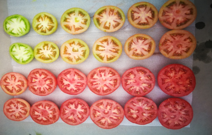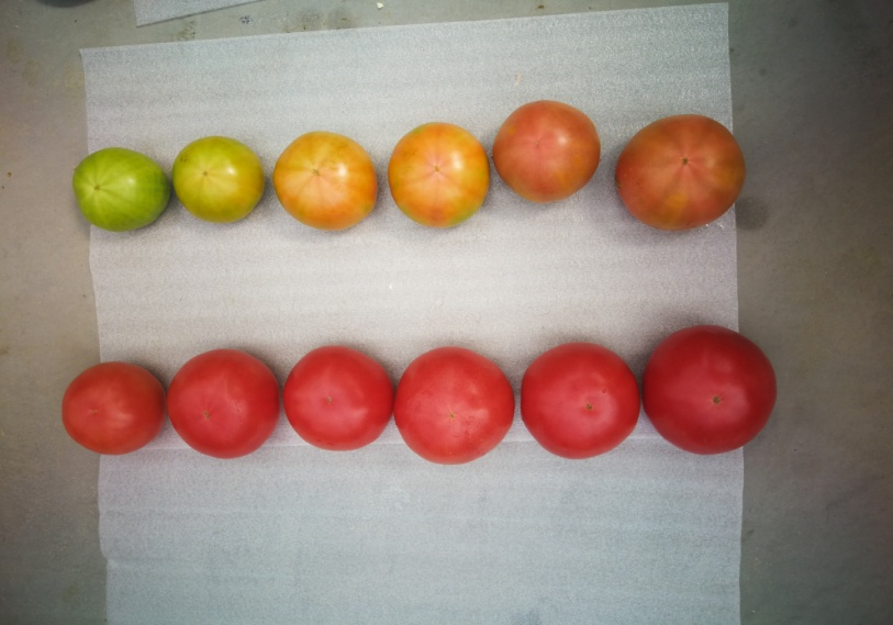 番茄采收标准与品种、销售距离、销售方式有关。判断适合采收的依据,以到达终端消费时,番茄品相最佳、品质最好为原则。应根据品种特性、食用方法、销售方式、销售距离,采后直接销售还是需要贮藏,制定番茄采收标准。薄皮番茄应适当降低采收成熟度,减少裂果现象;夏季果实转色时间短,采收集中,销售压力大,如不能及时销售,应按照贮藏要求确定采收标准。夏季番茄过早采收,硬质番茄果肉硬、品质差,薄皮品种番茄风味淡,水果番茄品种可溶性固形物含量低,口感差。番茄采收成熟度一般控制在四至八成熟采收,具体根据品种类型、食用方式、销售方式决定。采收应在无雨水、露水干后采收;手接触会造成果皮和果肉内部发生变化,采收时应佩戴手套。