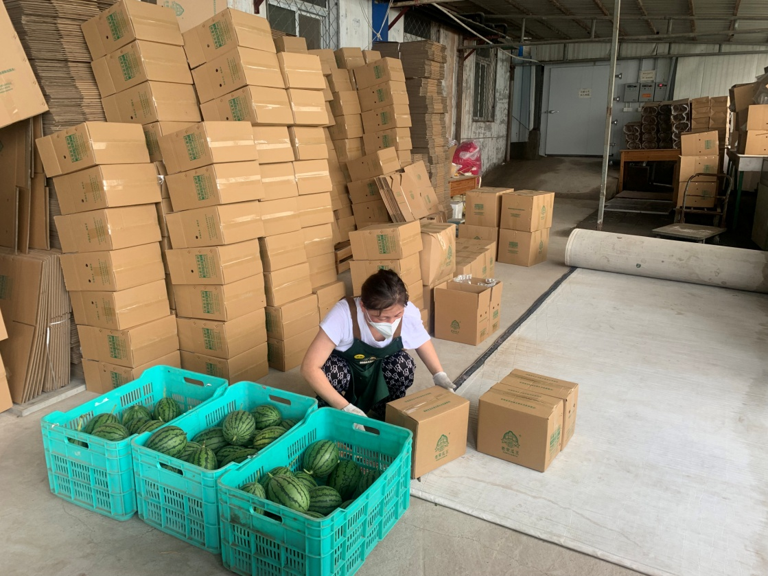 夏季高温西瓜旺销,一箱箱西瓜装上了快递车,准备由北京发往外地。北京市大兴区老宋瓜园第三代传承人宋志佳指着琳琅满目的各种西瓜包装箱介绍,老宋瓜园从2014年开始电商销售西瓜,西瓜包装经历了普通纸箱、纸箱+泡沫、纸箱+充气柱几个阶段,西瓜破损率由最高时的20%降至目前的0.8%。您看这个是北京市农业技术推广站指导设计的减重西瓜包装,配送效果基本跟原来未减重之前效果相当,这种单粒、双粒西瓜包装不对比看不出来,实际上比以前使用的包装箱重量减了,制作纸箱价格降低了,增加了园区的收入。