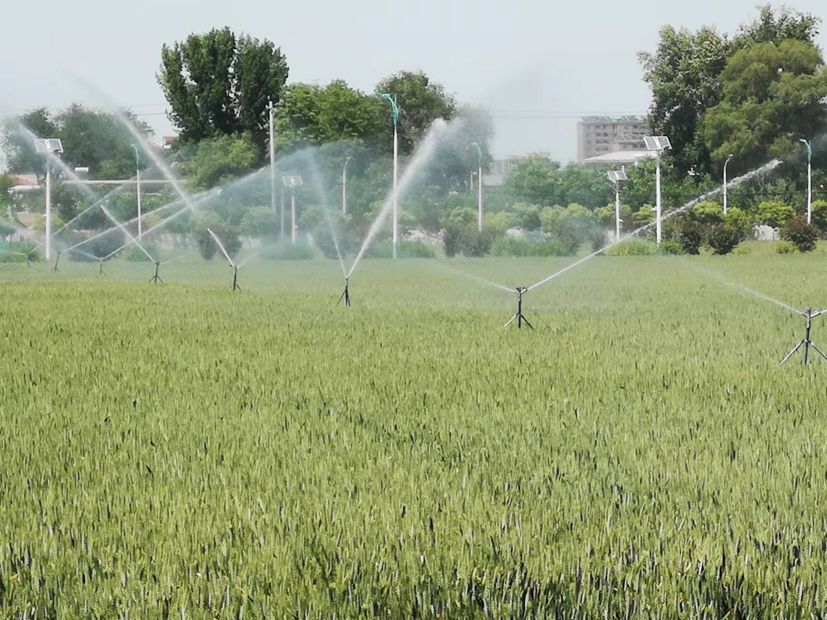 预防干热风危害。有条件的农户,在实施“一喷三防”的基础上,每7~10天增加喷施一次叶面肥(磷酸二氢钾或抗逆剂等),或在干热风发生前后及时喷施,增强植株抗逆能力,降低干热风影响,提高粒重、增加单产。有喷灌机、地埋伸缩式喷灌等先进节水装备的地块,可在干热风发生前后少量快速浇水,改善麦田小气候,抵御干热风及高温逼熟的影响,确保小麦正常灌浆。
