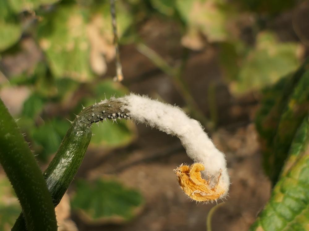 为害黄瓜等瓜类时,苗期至成株期均可侵染,部位包括茎蔓、叶片和果实。茎蔓感染后先出现水渍状斑,之后表面会生出白色棉絮状菌丝体。叶片染病时,先出现灰色至灰褐色湿腐状大斑,发病组织边缘与健康组织的分界不明显,湿度大时斑面上长出絮状白霉,最终导致叶片腐烂。果实染病,起初表现为水浸状斑,扩大后呈湿腐状,多数有白色菌丝体。