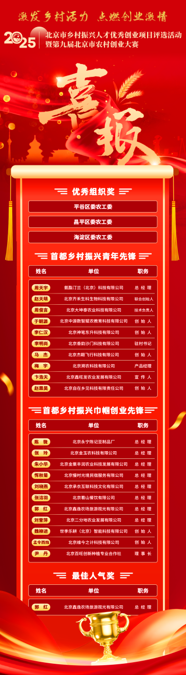 会议发布了2025年北京市乡村振兴人才优秀创业项目评选活动暨第九届北京市农村创业大赛优秀创业项目奖10个,进阶创业项目奖10个,入围创业项目奖9个;颁发大赛“最佳人气奖”1个,大赛“优秀组织奖”3个;颁发“首都乡村振兴青年先锋奖”10个,“首都乡村振兴巾帼创业先锋奖”11个。对优秀创业项目、进阶创业项目和入围创业项目分别给予奖励资金支持。