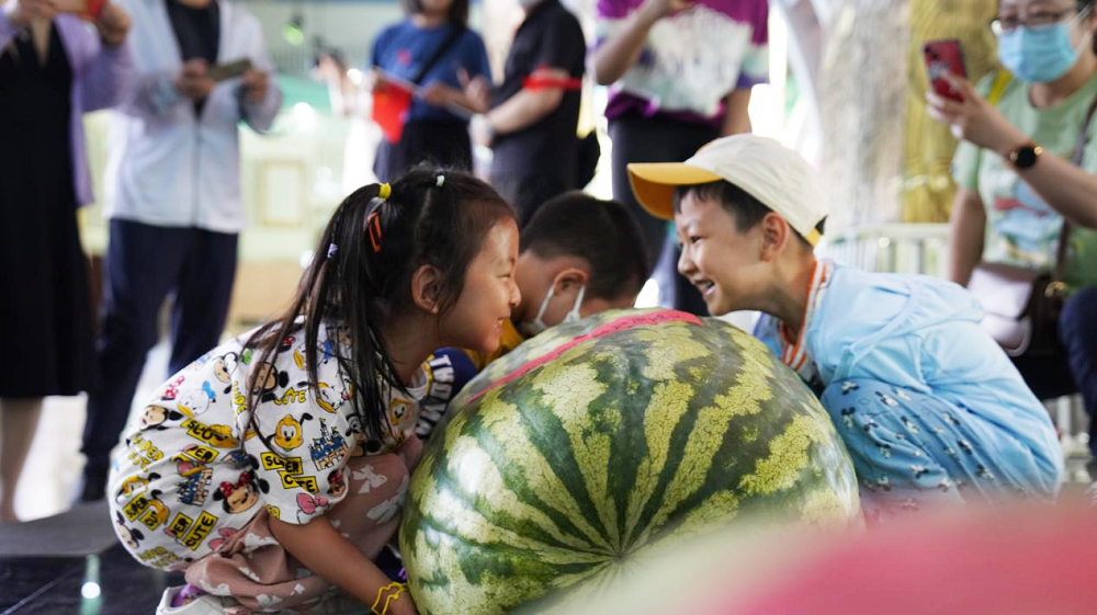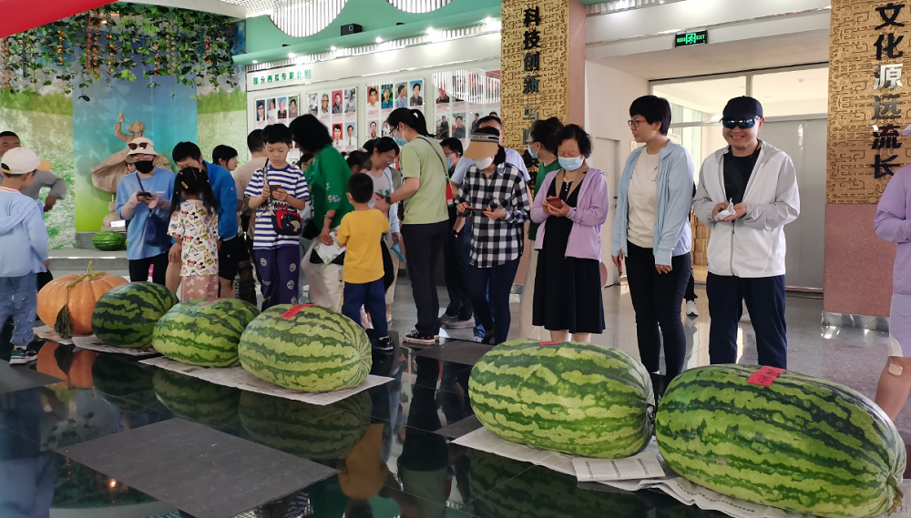 活动当天,市民们走进了坐落在北京市大兴区庞各庄镇的中国西瓜博物馆,绿叶衬托着大大小小西瓜的独特造型,仿佛穿越了时光,与古往今来千百年间不同时代的西瓜相会,见证这百年西瓜发展至今的奇妙时刻。从原始的野生西瓜到现代太空西瓜的历史变迁,现如今已有200余个西瓜品种,各种不同体型、不同颜色的西瓜、西瓜子、西瓜雕刻等衍生物妙趣横生。西瓜文化、古籍以及西瓜历史逸闻趣事更是令人眼前一亮。