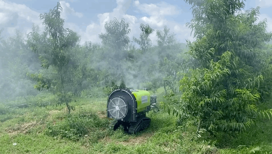 机器前部的激光传感器相当于它的眼睛,它把整个果树的树的形状测成点源头,通过点源头的变化,可以把树的绿色的植物量,在不同部位的叶面指数测出来,再通过计算方法变量喷雾,实现精准喷雾。