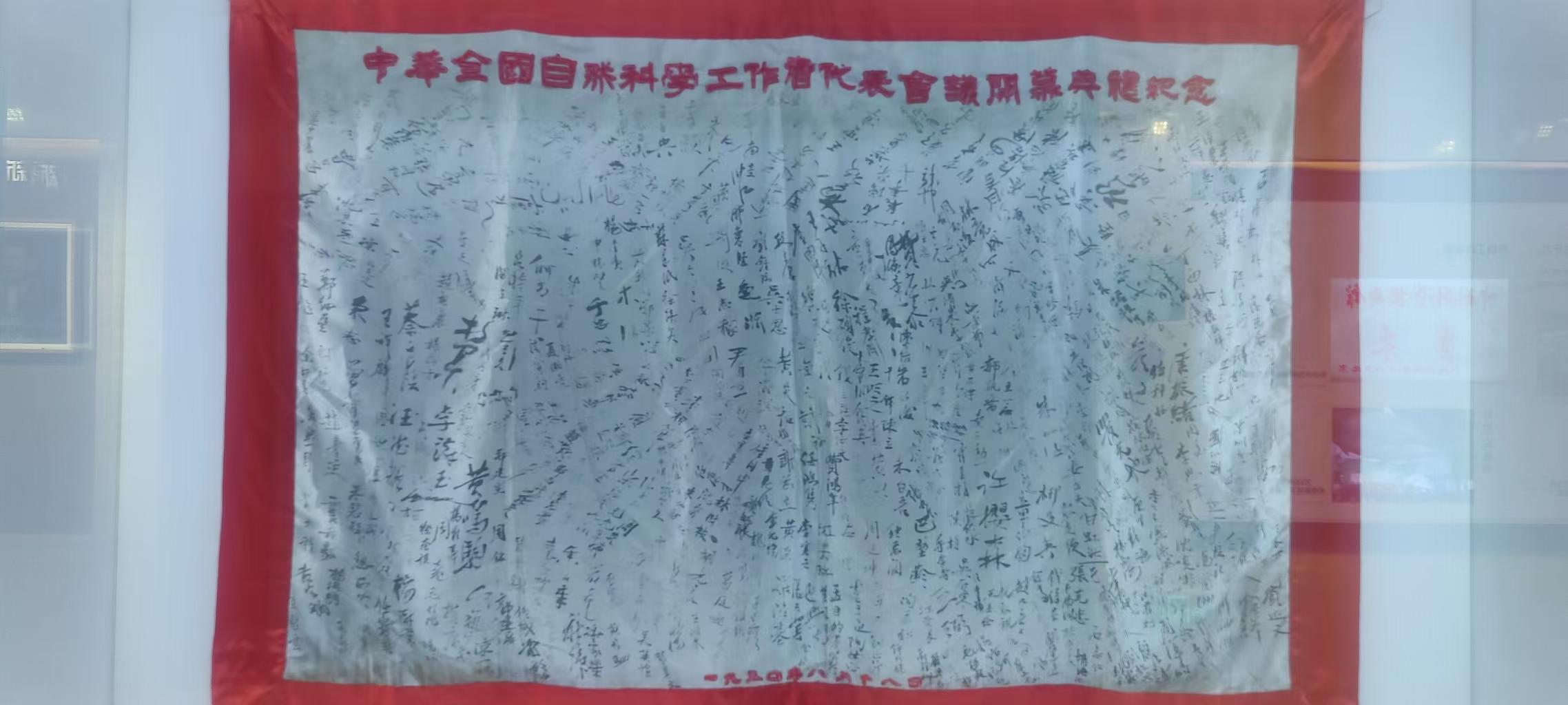 中国科技馆会堂展出的“中华全国自然科学工作者代表会议签名旗” 王文洁 摄