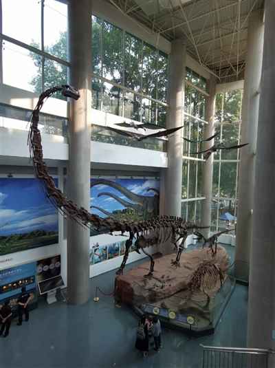 居于台阶高处俯瞰,可以看到“恐龙天地”。这里展示了以马门溪龙、沱江龙、禄丰龙和翼龙构成的群体造型,以及恐龙骨骼和恐龙蛋化石。冯老师特别提示我们留意一“盆”椭圆形的恐龙蛋化石:它们多是成对出现的。何以会是这样?冯老师说,研究得出的一个推测是:下这种蛋的恐龙,很可能具有双产道!