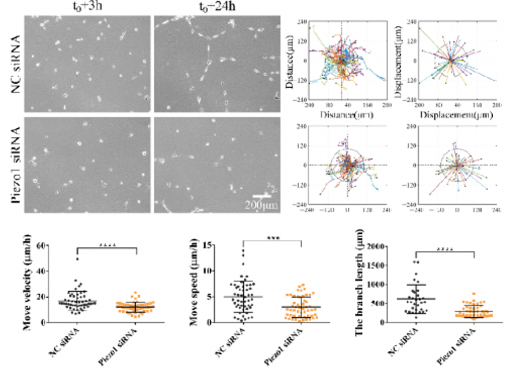 团队进一步揭示了力学信号转导的核心分子机制。他们首先揭示了α-Catenin的双重调控作用:作为力敏感分子,α-Catenin通过调控黏着斑形成,介导细胞-基质黏附与力学响应,同时促进细胞间稳定连接,是分枝结构形成的关键;探索了Piezo1通道的力学解码功能:通过研究证明机械门控离子通道Piezo1可感知基质张应力,触发钙离子内流,驱动细胞定向迁移。抑制Piezo1活性后,细胞力学响应能力显著下降,证实其在长程力通信中的关键作用。