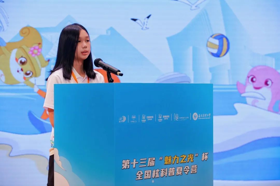 中国核学会副秘书长高克立代表主办方致辞,他希望通过“魅力之光”活动,让更多公众近距离领略核科技魅力,激发全社会特别是青少年群体崇尚科学、探索未知的兴趣,为全民科学素质水平提升和核强国建设作出更大贡献。福清华南初级中学的林依同学代表营员发言,她表示对“魅力之光”夏令营充满期待,希望通过活动增进对核能的科学认知,未来助力核科普传播工作。