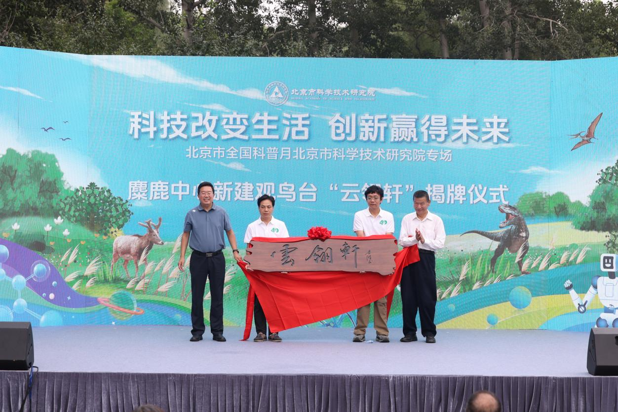 北科院副院级领导刘子亮、中国科学院科学传播中心副主任邱成利共同为麋鹿中心观鸟设施“云翎轩”揭牌。