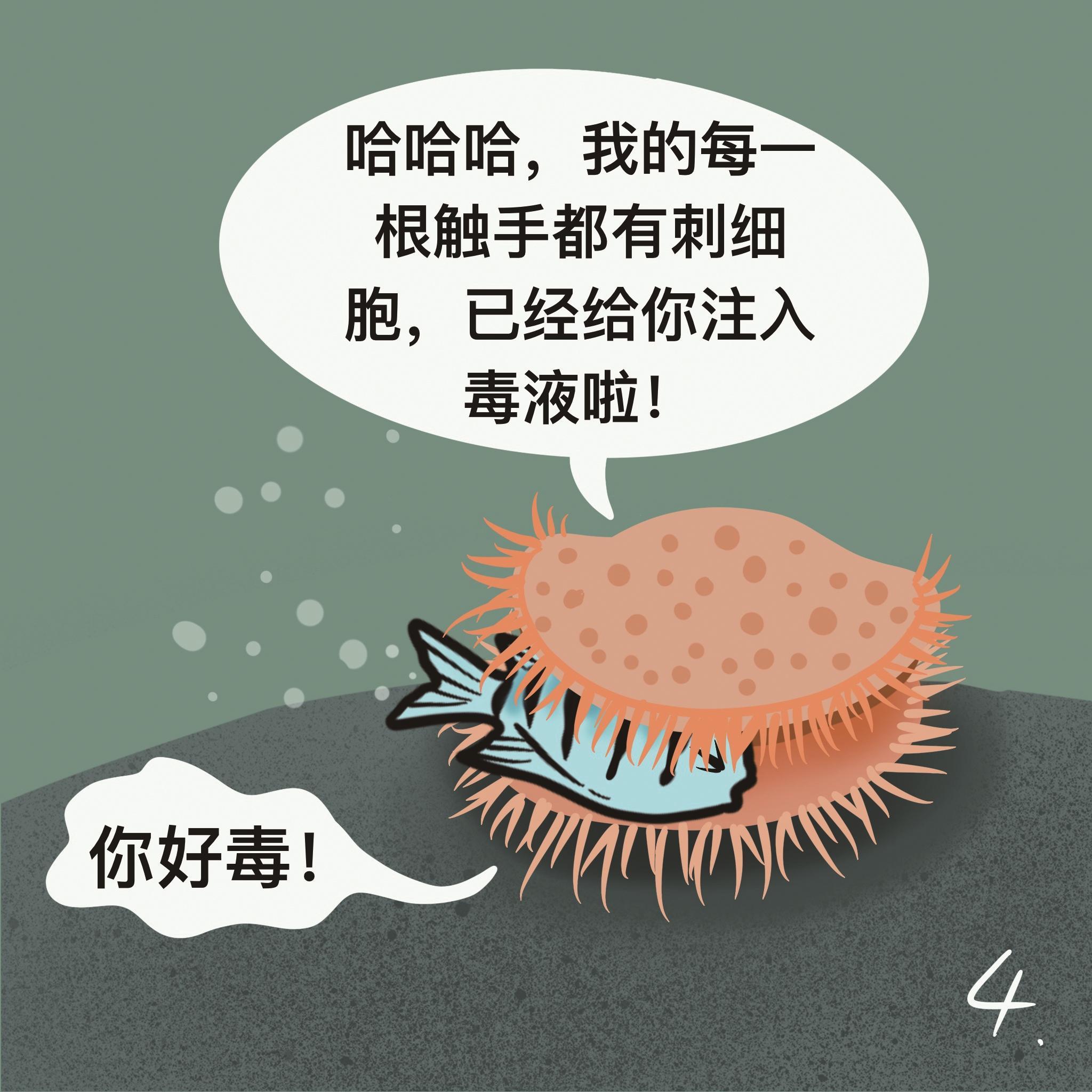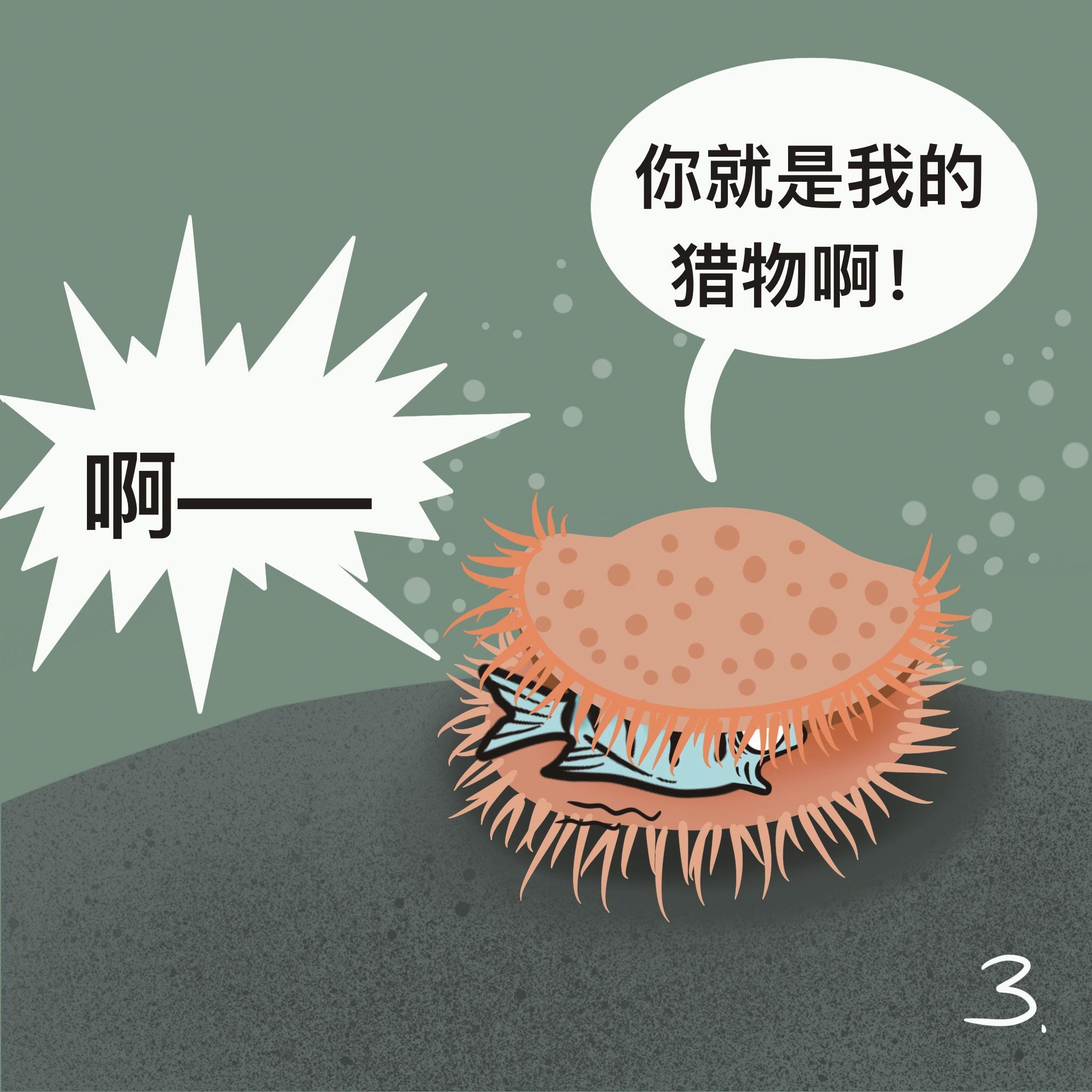 捕蝇草海葵以虾、蟹、小鱼等动物为食,它的捕食系统精妙又高效:首先会用基盘固着在海底,再把长有数十根触手的口盘朝向水流。当猎物接近时,柔软的口盘能瞬间从中间弯折,形成封闭牢笼。其触手上的刺细胞随即注入毒液,待猎物被麻痹后,再通过中央的口部缓慢享用这份“美食”。