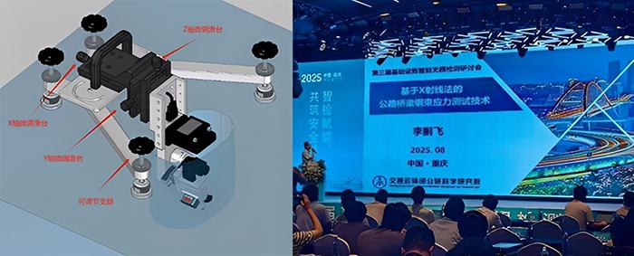 为了解决既有X射线测试装置设备体积大、调试速度慢、测试角度受限等问题,团队联合应力测试单位研发了便携式方案和四脚式方案两套工装,搭配微型测距仪,形成适用于桥梁结构现场的DX-4001型X射线法测试装置。研发的“StOnline在线应力检测软件”可对测试条件进行可视化处理,自动开展测试过程和生成测试报告。他们还对研发设备在X射线应力测试过程中的实时辐射强度进行了全方位测试,表明全时段辐射周围剂量当量率不大于1Sv/h,满足《低能射线装置放射防护标准》规定。