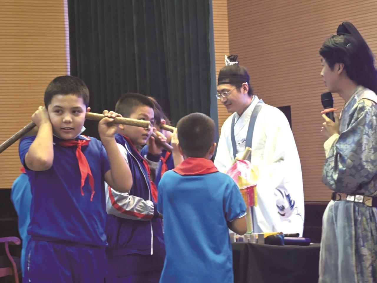 在古装剧中经常能见到剧中人物使用长短不一的竹管吹奏乐曲。紫竹院公园团队成员付育告诉同学们,古人确实是用竹管确定音律的。这是因为,人们吹奏时竹管中的空气会发生振动,将竹管制作成粗细相等、长短不同的律管,就会获得不同的音调,律管越长音调越低。