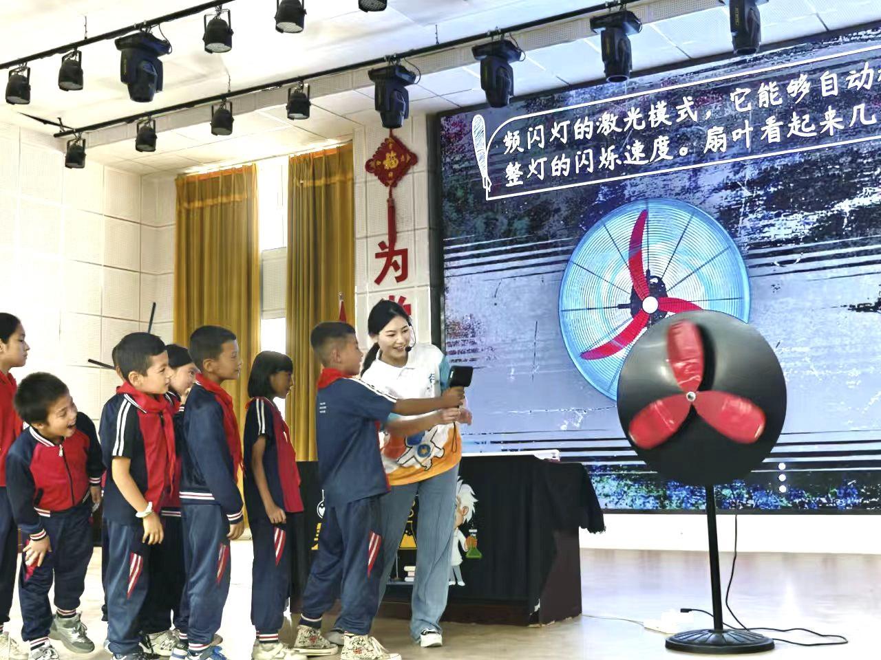 当频闪仪的频率超过风扇转动频率时,同学们发现扇叶好像出现了倒转。李海菡解释,由于光的频闪效应和视觉暂留现象,我们的眼睛受到了欺骗,误以为风扇出现倒转。