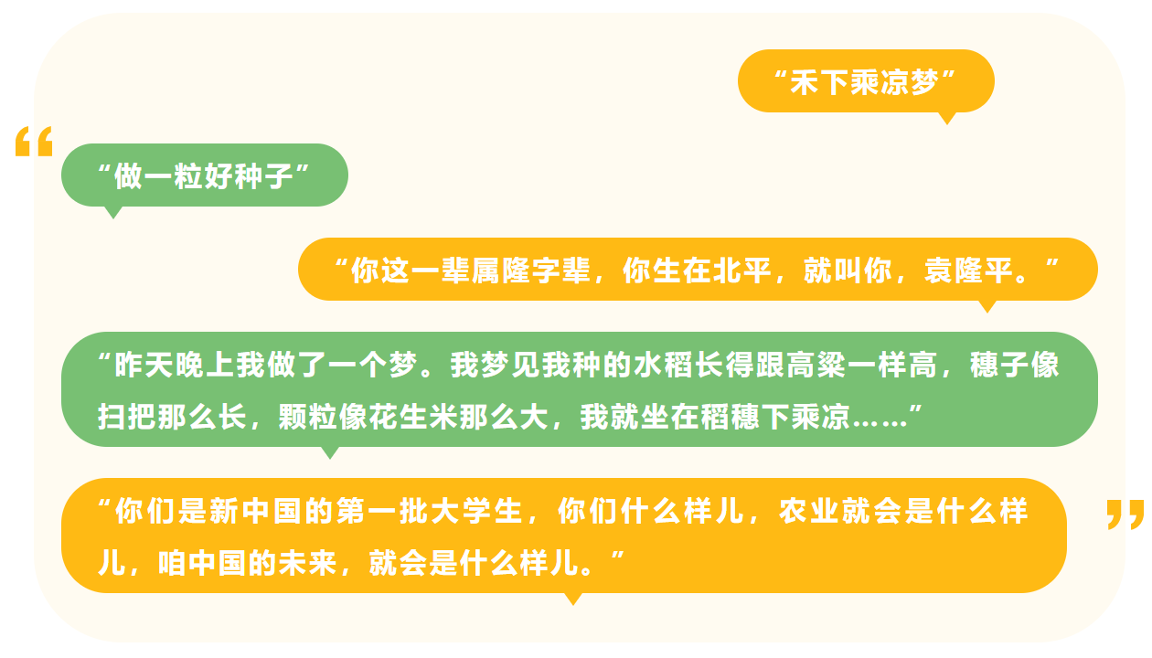1949年他考入西南农学院(西南大学前身之一),在这里奠定了农学研究的基础,开启了“让所有人远离饥饿”的毕生追求。西南大学将话剧创排作为弘扬科学家精神的重要载体,通过深入挖掘校史资源中袁隆平的求学轨迹与精神遗产,让青年学子在艺术实践中感悟“爱国、创新、求实、奉献、协同、育人”的科学家精神。此外,袁隆平院士于2016年在西南大学设立了“袁隆平奖学金”。
