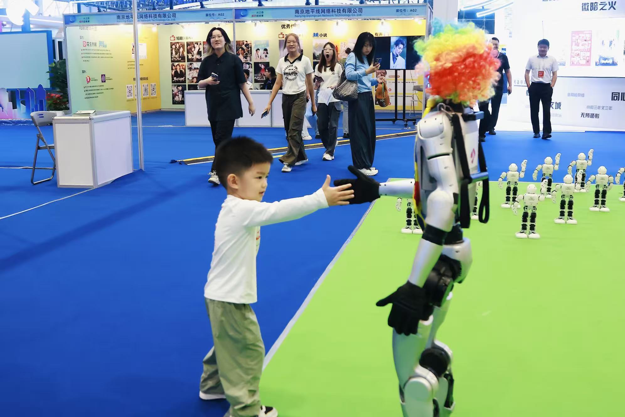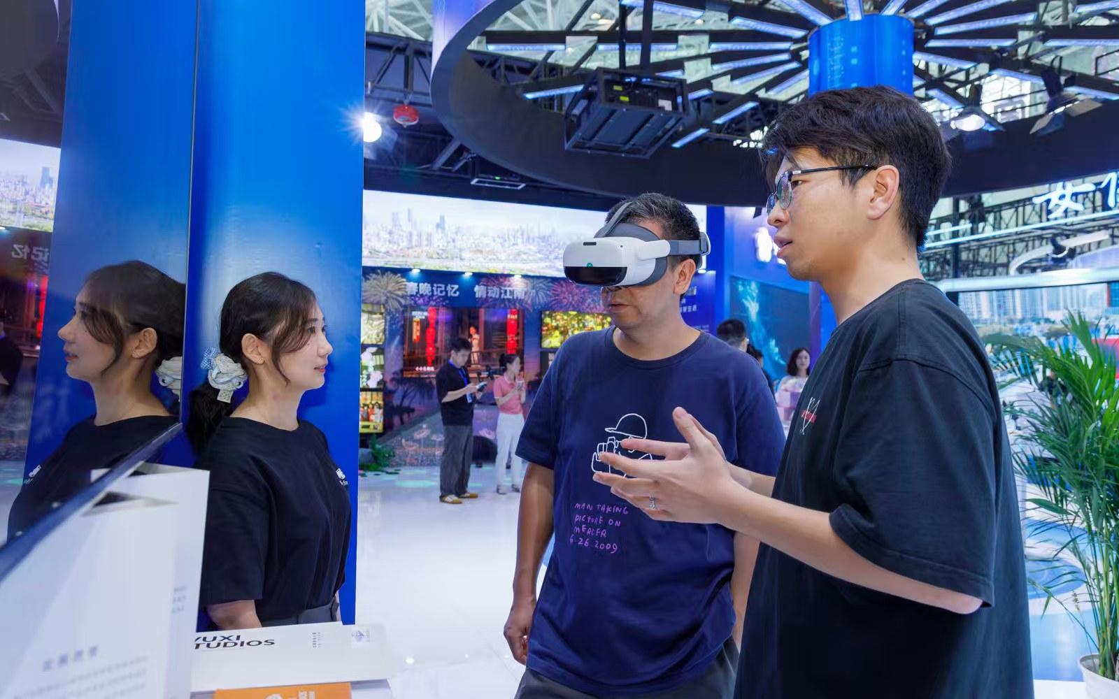 在以活动促展上不断迸发出青春活力。“青春有yyoung”、苏超第二现场、“漫动视听”是展会精心策划的三项特色活动。“青春有young”以长三角三省一市40多所高校的240部AI绘画和视频作品为基础评选出百优作品,并安排在会展“世界树”上展出,高校学子们在博览会撒下理想的种子,让自己的创作才华和未来成就,亭亭如盖、万顷碧天。“苏超第二现场”六频同屏共放,4K超高清巨幕,给球迷带来“影院级”足球观赛体验,展会搭台、经济唱戏、群众受益。“漫动视听”国潮秀和高校动漫社团轮动秀,吸引了不同年龄层次的公众。一老干部团队来观展,看见cosplay演员的《哪吒》经典人物造型,赞叹扮相漂亮。他没看过电影,但突然理解了为什么自己的孙子喜欢哪吒。从老干部的“不理解”到“被圈粉”,展现了经典神话IP的强大魅力,更体现了传统文化与现代潮流的代际融合。一部电影,连接祖孙情;一个IP,打破代际差。