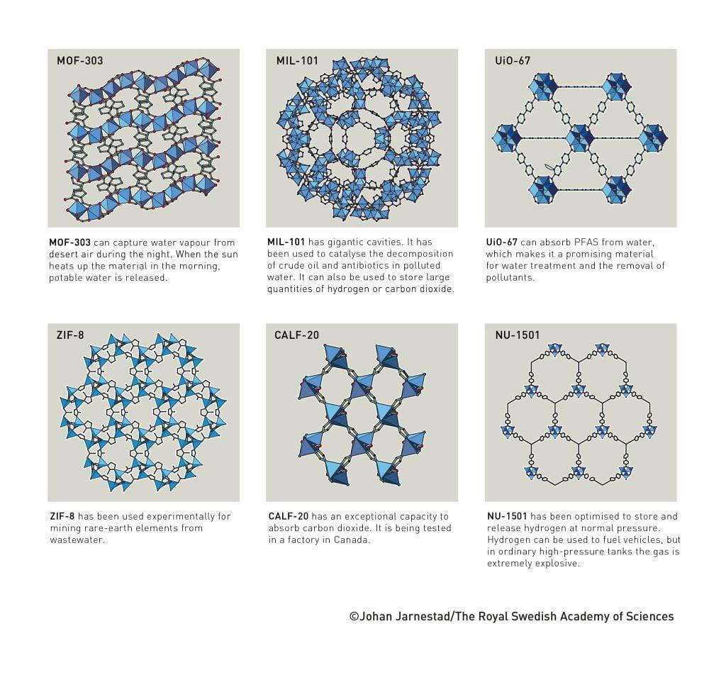 这种新型分子结构内部拥有大量空腔,分子可在其中自由进出。得益于三位科学家的工作,化学家如今已能设计出数以万计的不同MOF,为化学领域带来一连串“奇迹”。