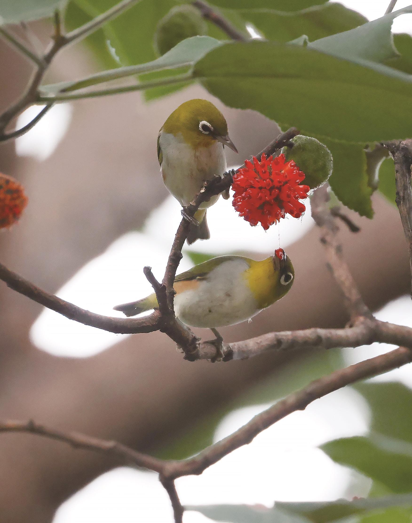 作为典型树栖鸟类,红胁绣眼鸟几乎不落地,性情活泼好动。除繁殖期外常集群生活,冬季群体规模可达50-60只,有时还与暗绿绣眼鸟混群形成“鸟类小社群”。其嘴部构造极具功能性:细小微弯的喙便于啄食浆果与昆虫,伸缩自如的舌头顶端有角质纤维簇,既能吸食花蜜,又能高效舔食果浆,完美适配不同季节的食物需求。