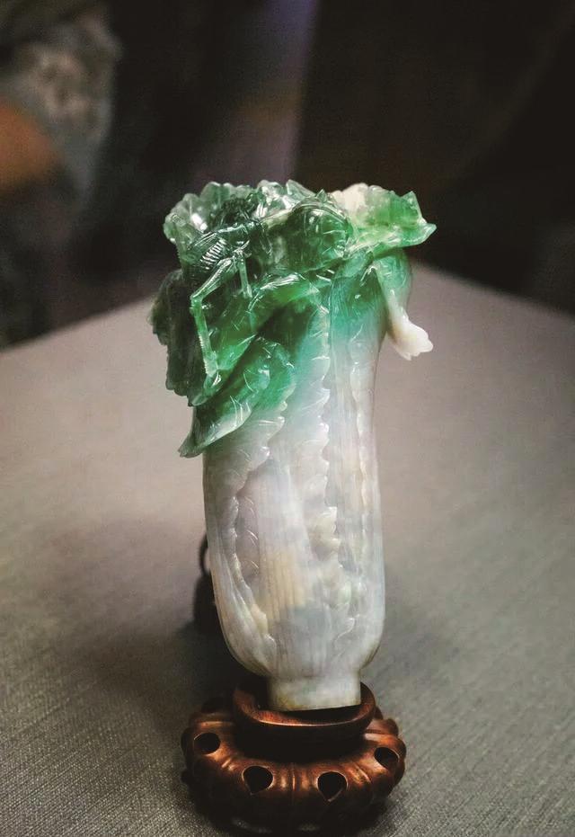 翠玉白菜以半透明翠玉为原料,工匠“因材施艺”,巧妙利用玉石天然色渐变,将白色雕刻成菜帮,绿色雕刻成菜叶,层次分明,叶脉清晰,菜叶上的螽(zhōnɡ)斯与蝗虫形态逼真。在清代,白菜代表清清白白,螽斯与蝗虫寓意多子多福,因而翠玉白菜也就成为绝佳的嫁妆选择。据传,这件翠玉白菜是清光绪帝瑾妃的嫁妆。