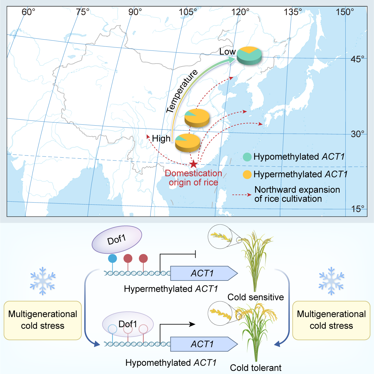 中国科学院遗传与发育生物学研究所曹晓风团队研究发现,连续多代冷胁迫能诱导水稻基因组特定位点发生DNA甲基化变异,不仅直接参与水稻耐冷性状的形成,还可稳定遗传,并在高纬度低温环境适应过程中发挥关键作用。该研究首次为延续两百余年的“获得性遗传”之争提供了关键分子证据,拓展了现代进化理论框架。研究同时开创了定向环境胁迫的抗逆育种新思路,为应对全球气候变化下的农业挑战提供了新方案。研究获Nature、Trends in Plant Science、Molecular Plant及JIPB期刊专评。