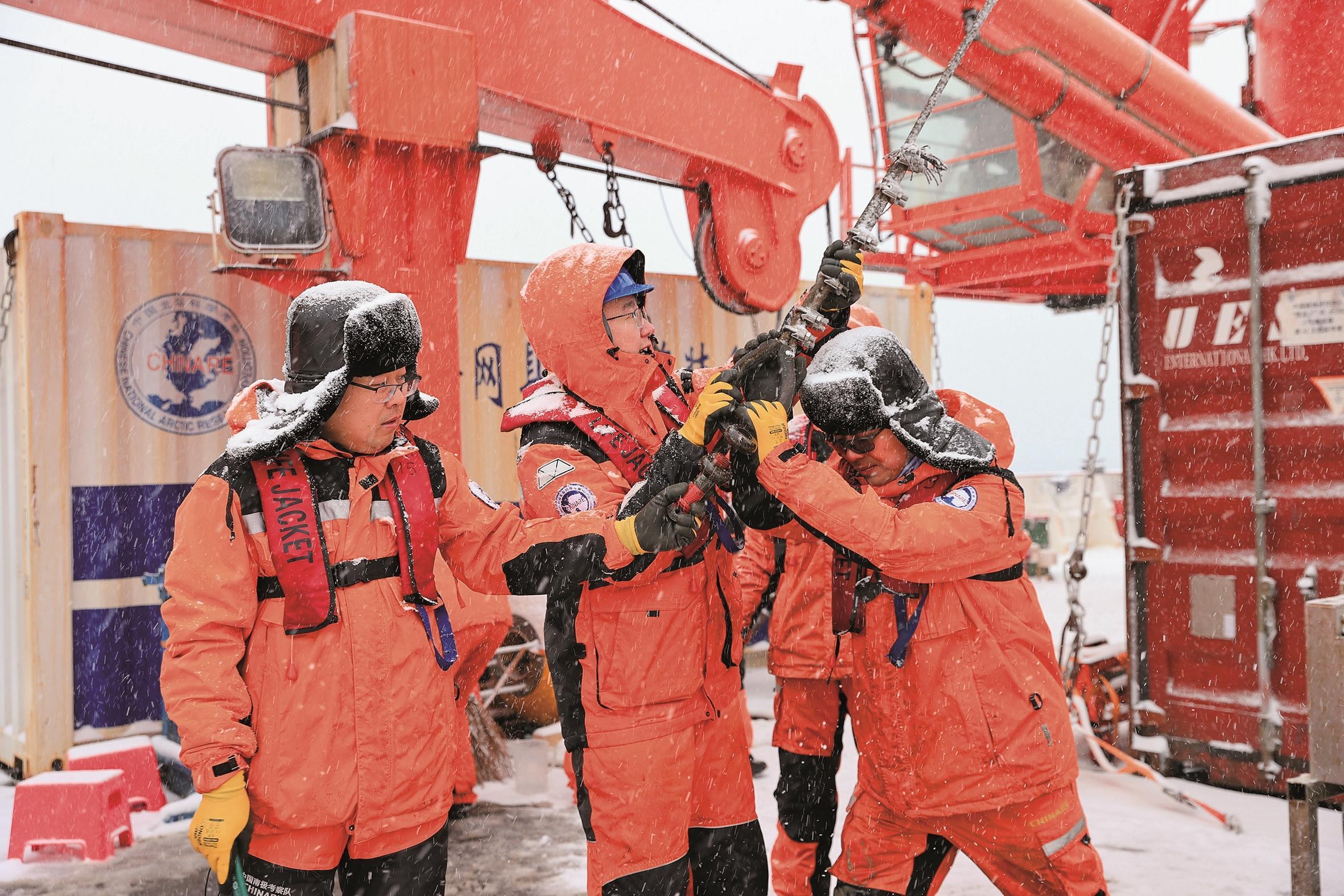 2月8日,南大洋宇航员海域风雪骤起,“雪龙2”号的艉甲板很快被皑皑白雪覆盖。大洋队员唐正和队友们顶着风雪,进行箱式抓斗作业。这些来自深海的泥巴紧紧地吸附在取样器的底部,唐正毫不犹豫地爬上取样器,靠自身体重压下开合机构来获得表层沉积物样品。设备和甲板都像被鹅毛大雪“抛了光”,变得异常光滑,4位队友分两边牢牢抓住唐正才能安全完成操作。