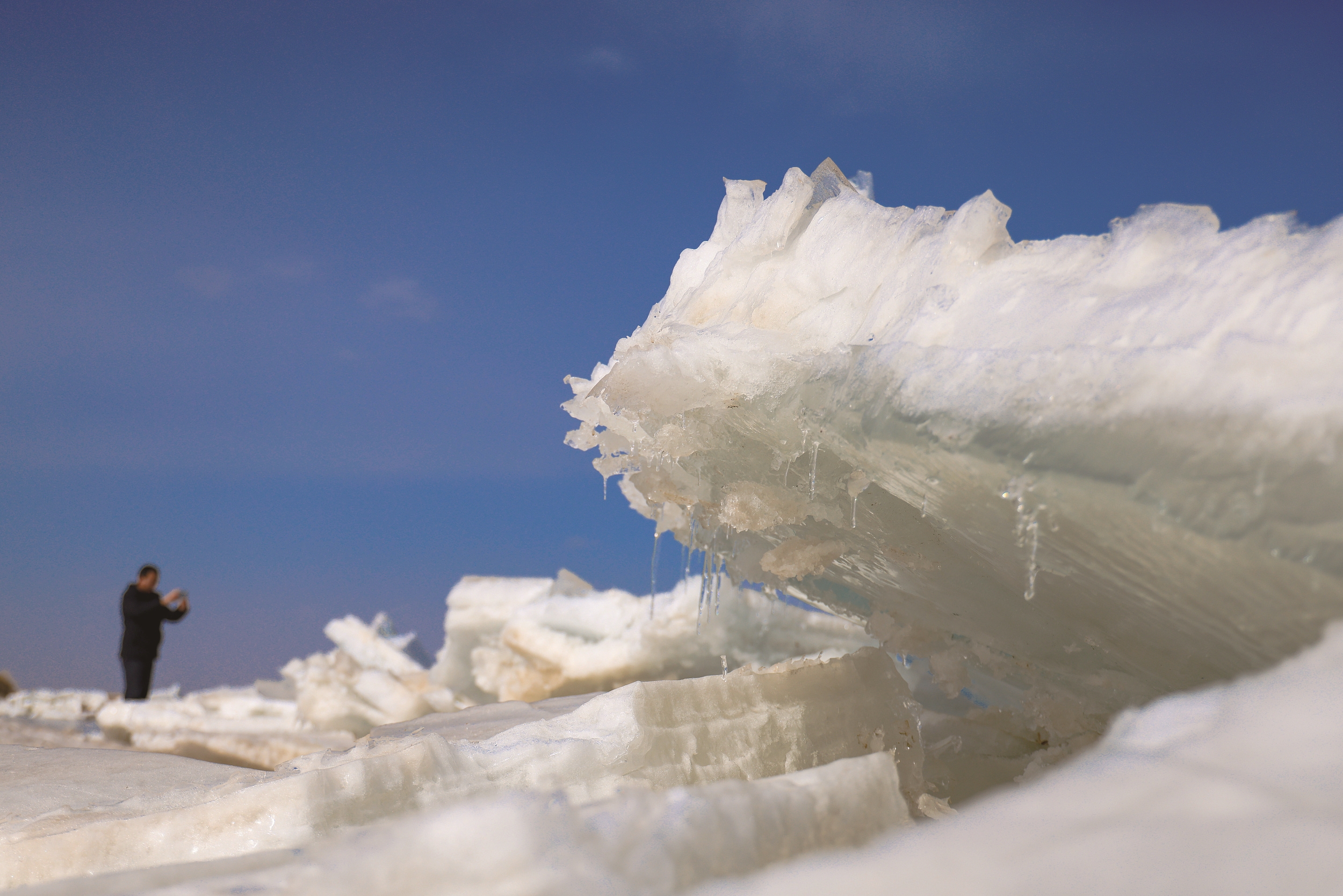 2月28日,新疆维吾尔自治区巴音郭楞蒙古自治州博湖县境内的博斯腾湖出现推冰景观,吸引摄影爱好者和游客前来观赏拍摄。推冰是指冰雪逐渐消融时,湖面上的冰破裂、隆起的自然现象。视觉中国供图