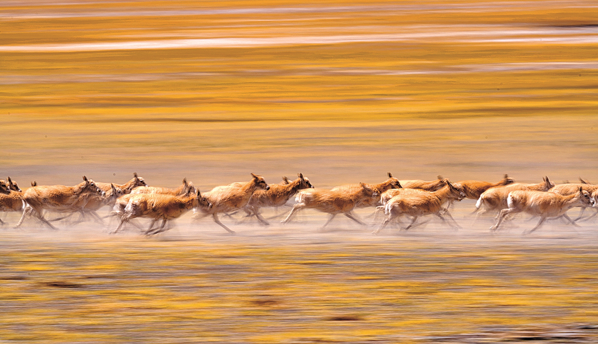 每年5月至7月,藏北羌塘国家级自然保护区内的母藏羚羊进入迁徙繁殖季,数万只母羊向着羌塘保护区深处玛尔盖茶卡附近和玉龙河畔的产羔地迁徙,在此生下小羊羔后再回迁。图为6月13日羌塘国家级自然保护区中,迁徙的藏羚羊正在奔跑。新华社记者 费茂华 摄