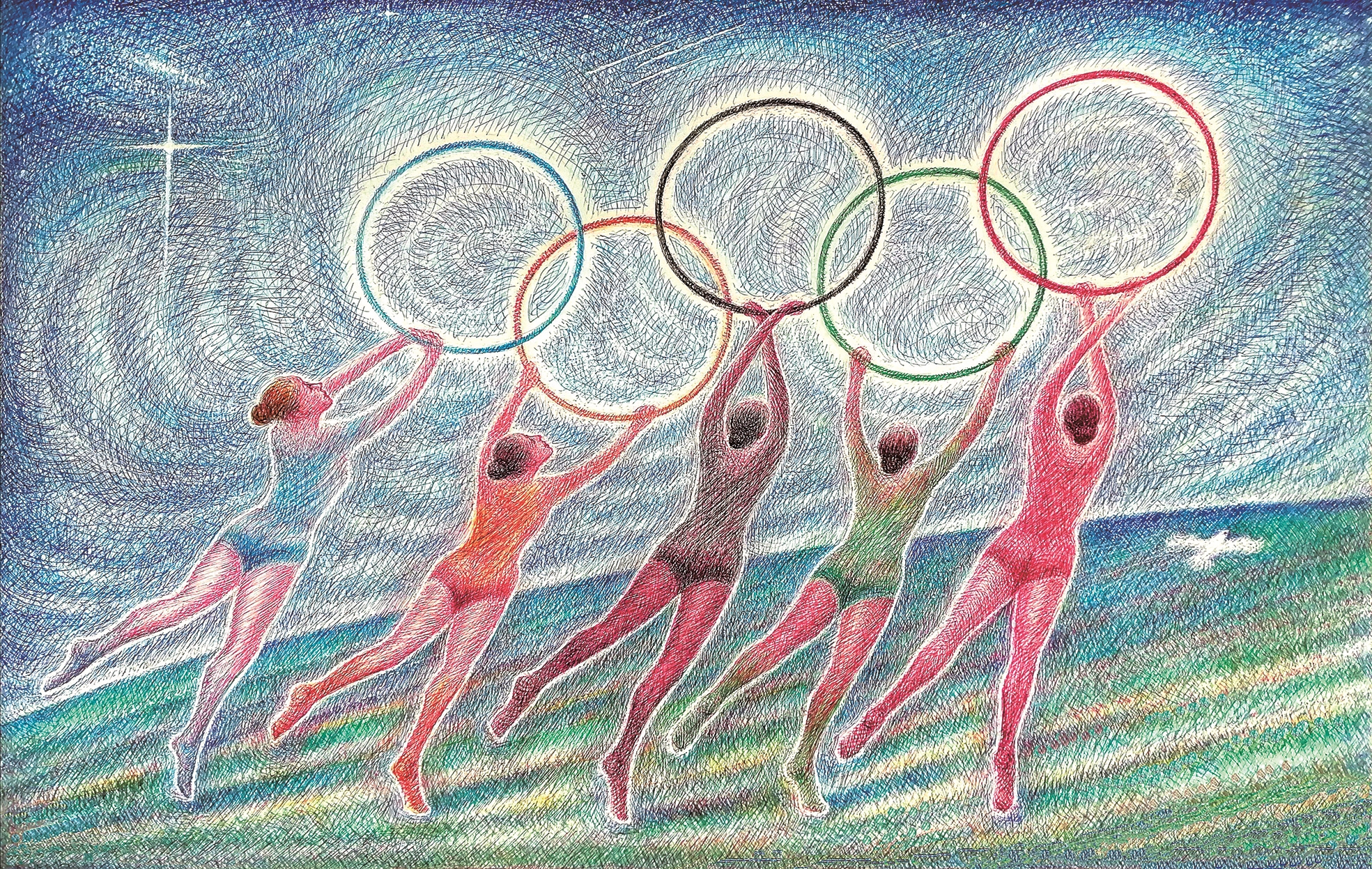 这幅作品将不同肤色和衣着的运动员对应奥运五环,表现了不同种族和人群之间和而不同、互惠共存的理念。奥运五环之间的连接,也隐喻着数学集合论上的“交集”元素。