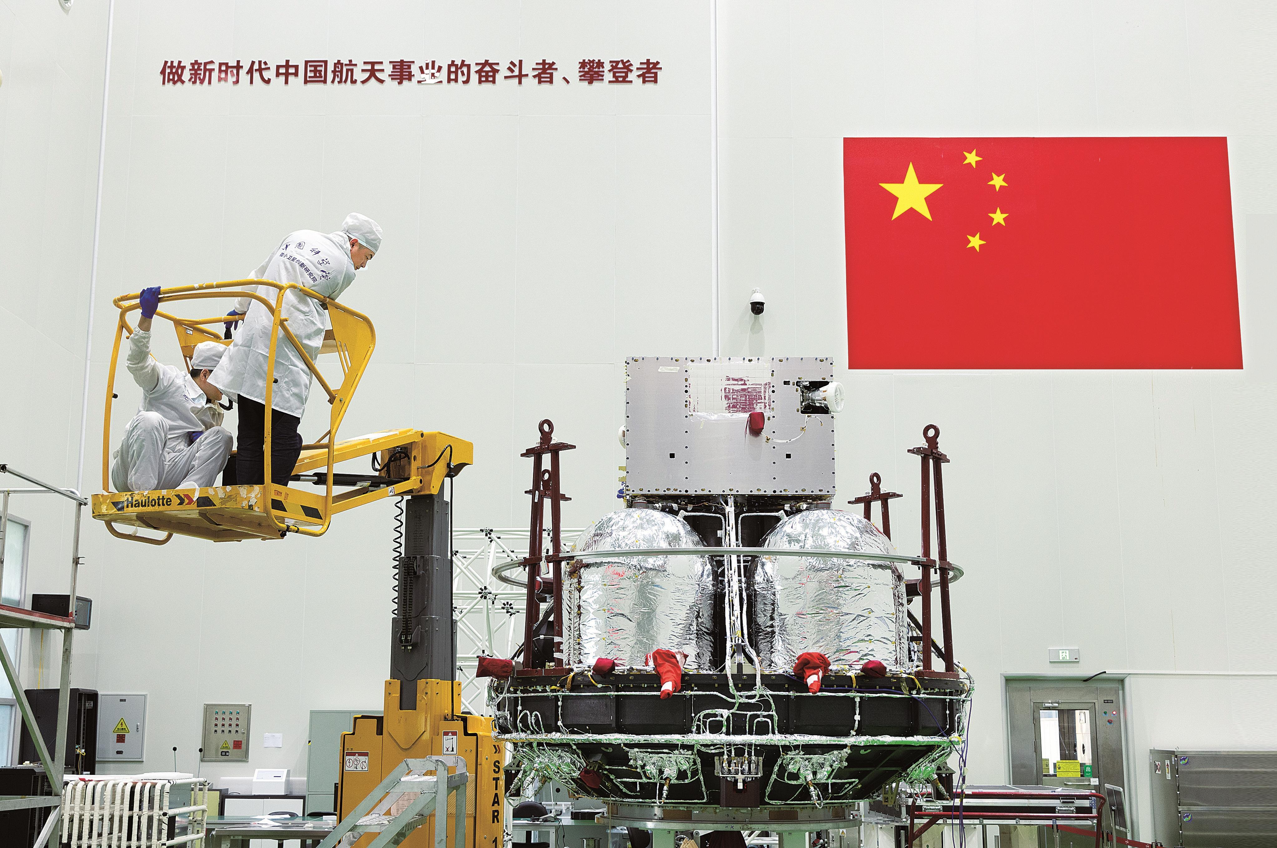 中国科学院空间科学(二期)先导专项太阳风-磁层相互作用全景成像卫星(SMILE,简称“微笑”卫星)目前已经完成国内所有研制工作,即将启程赴欧,与欧洲空间局负责研制的载荷舱一起开展正样星整星集成与测试。图为11月4日,在位于上海的中国科学院微小卫星创新研究院总装厂房,科研人员对“微笑”卫星进行最后的检查。 新华社记者 金立旺 摄