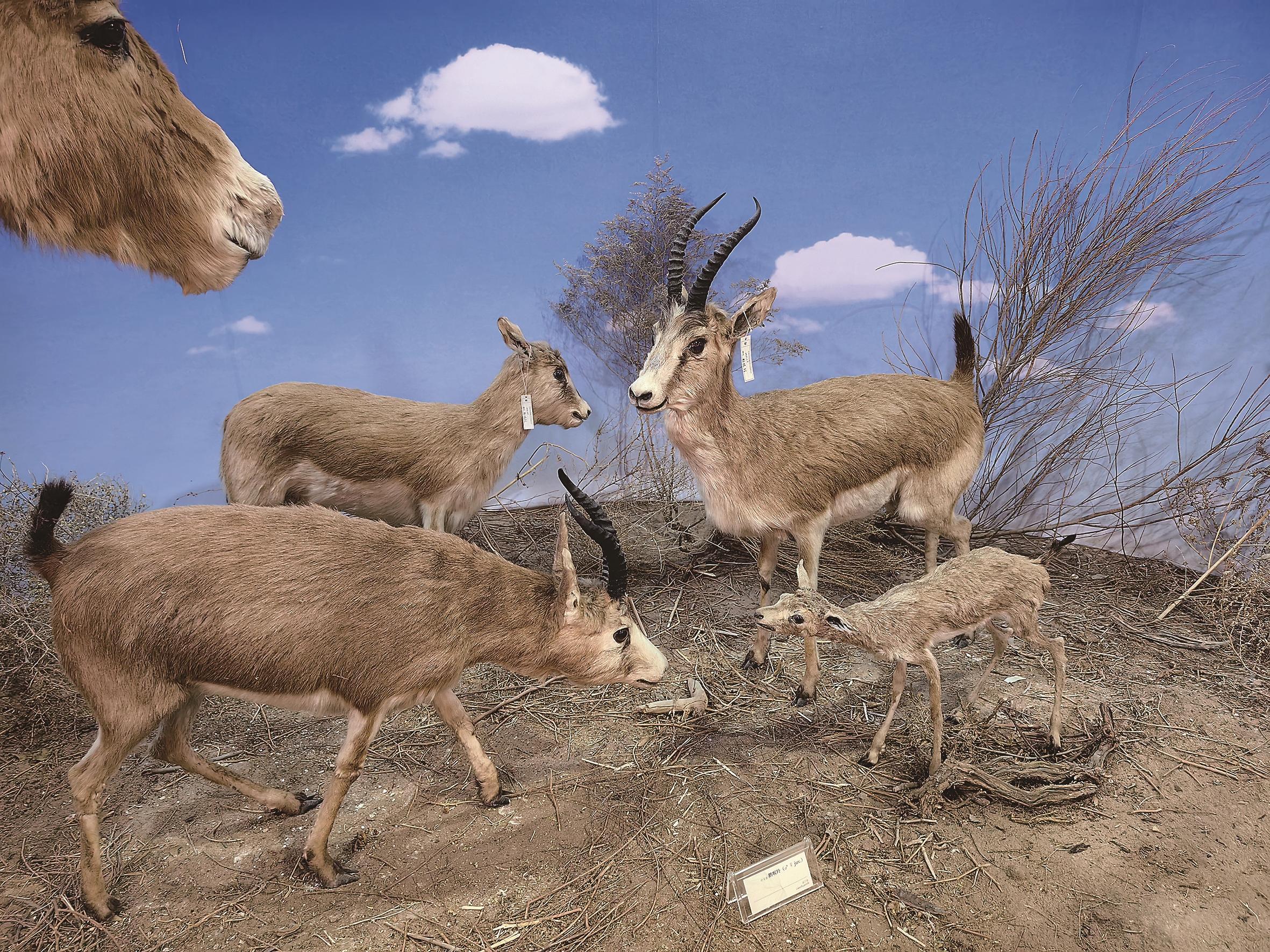 鹅喉羚属典型的荒漠、半荒漠区域生存的野生动物,体形似黄羊,因雄羚在发情期喉部肥大,状如鹅喉,故得名“鹅喉羚”。