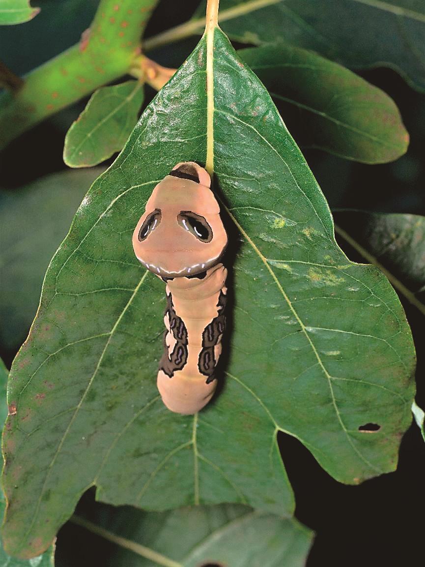 尤其是在5龄幼虫时,“大眼外星人”竟然将自己“变化”为一条毒蛇,虽然“个子”矮小,但它的“大头”却占据身体的三分之一,当有敌情时它会吐出像蛇一样的丫状舌头——触角,模仿蛇吐信子,并散发出难闻的气味,像蛇似的做出攻击姿态,恐吓或逼退敌人。