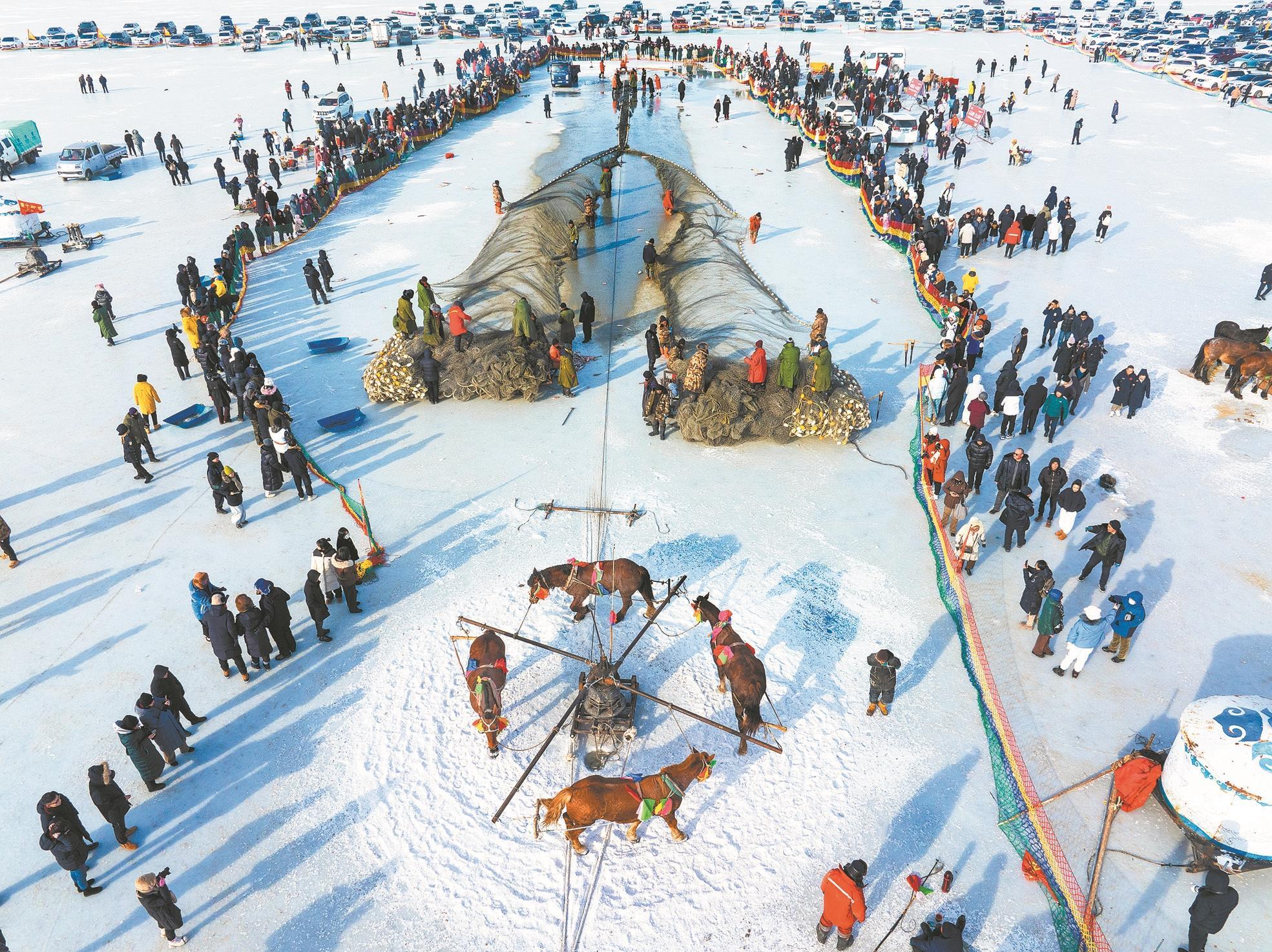 深水下网,浅水出网,大个头的青鱼、肥嘟嘟的“胖头”、鲤鱼在收紧的渔网中不停翻腾着,溅出阵阵水花,呈现出“万鱼跃龙门”的壮观景象。新春将至,年味渐浓!连日来,吉林查干湖、黑龙江镜泊湖、新疆博斯腾湖、江苏白马湖等水域先后举行大规模冬季捕鱼活动,一条条活蹦乱跳的鱼儿,从这里“游上”人们的餐桌。