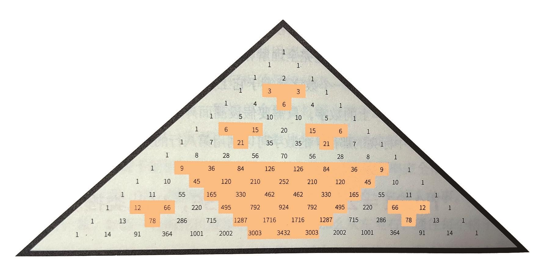 杨辉三角(欧洲称“帕斯卡三角”)在我国古代大多被用来作开方的工具。它最本质的特征是:两条斜边都由数字1组成,其余的数则等于该数上方的两个数之和(参见本版图④)。这也就意味着,可以根据某一行的数字,推算出下一行的数字,三角的底边会越扩越大。