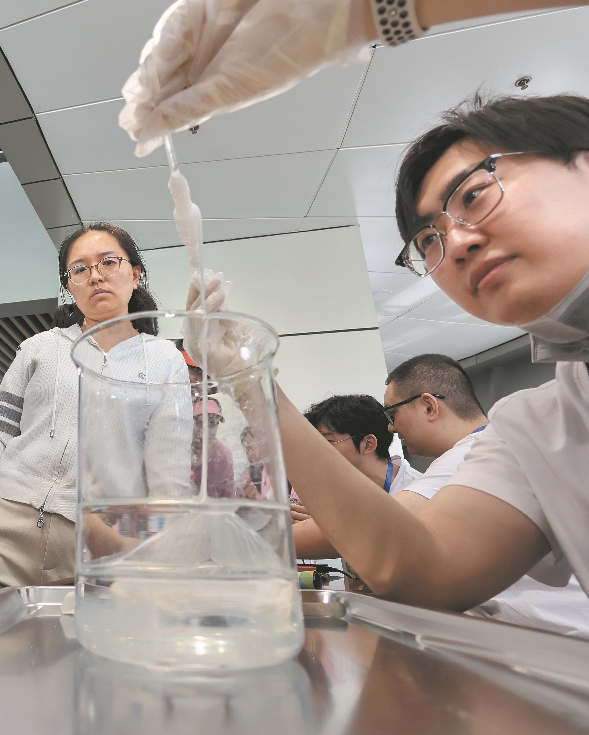 给苹果做“体检”、探秘沙塔蠕虫的建筑智慧、解锁防水纸张的奥秘、感受液态空气“充电宝” 的能量奇迹、遨游奇妙的低温世界……在中国科学院理化技术研究所,30余个互动科学实验让这里变成了“科学乐园”。科研人员表演的《哪吒来了!解锁电影里的超能力》,更是用科学实验的方式为观众解读了哪吒神话里的“超能力”。