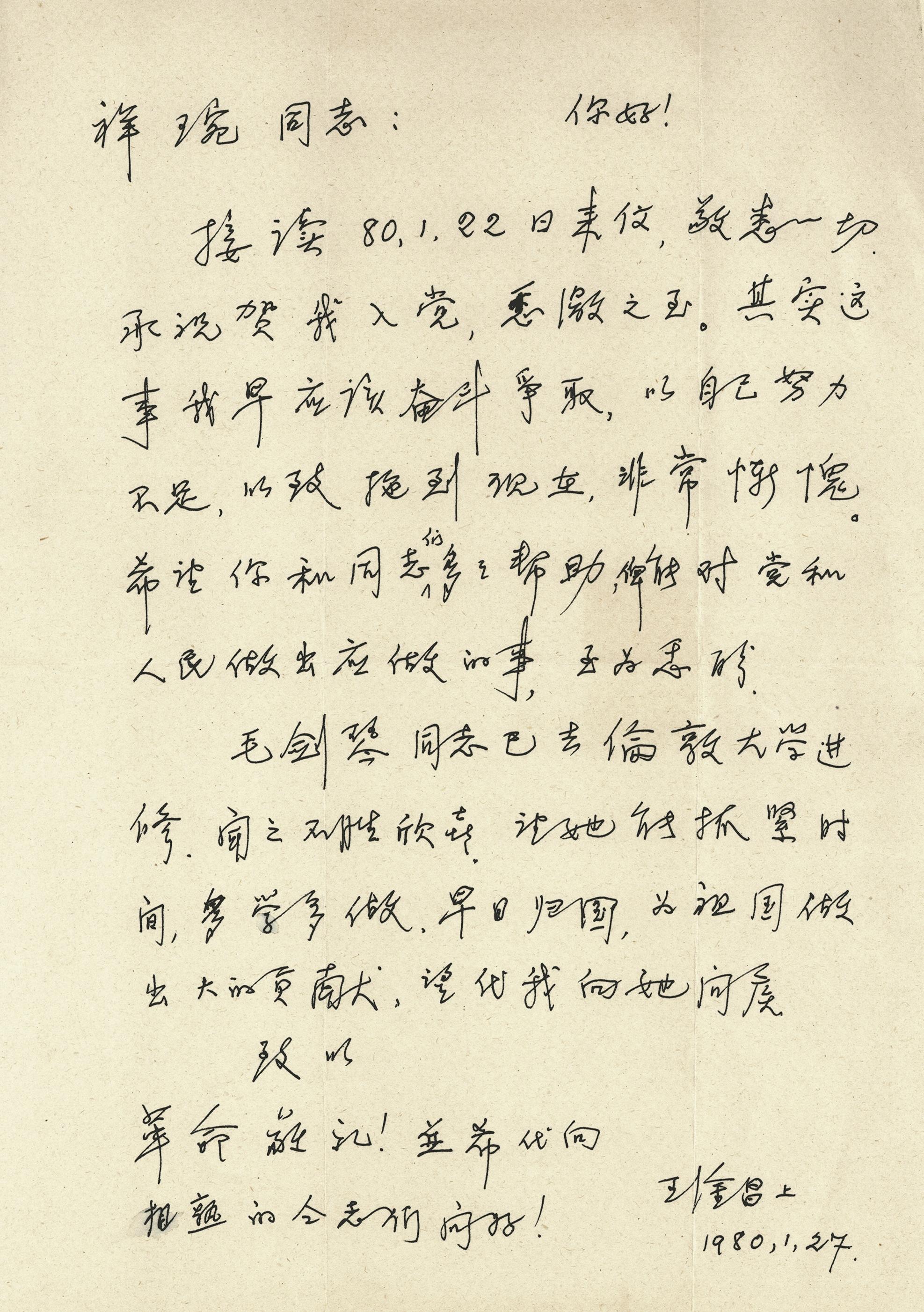 王淦昌入党的消息传出后,一位年轻同事杜祥琬写信道贺。5天后,杜祥琬收到回信,王淦昌在信中说:“其实这事我早应该奋斗争取,以自己努力不足,以致拖到现在,非常惭愧。希望你和同志们多多帮助,俾能对党和人民做出应做的事。”他还提到杜祥琬的爱人:“毛剑琴同志已去伦敦大学进修,闻之不胜欣喜。望她能抓紧时间多学多做,早日归国,为祖国作出大的贡献。”正如王淦昌所望,毛剑琴学成归国后,也为中国的科学事业奉献一生。