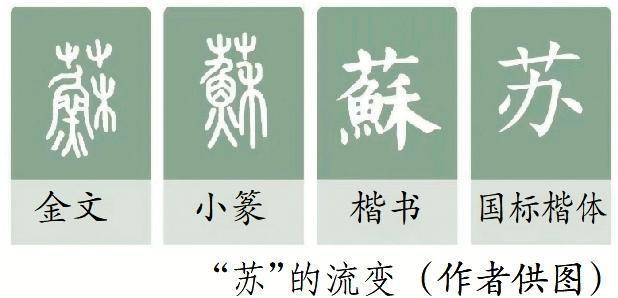 苏,其字形有不同说法。有人认为:金文有两棵草、一个“木”,还有一条鱼,这表示古人捉到活鱼之后,用草茎或者树枝穿过鱼鳃,把鱼提起来,方便拿着走。小篆中,“木”写成了“禾”,强调稻草、草茎。后来这个字慢慢演变成了繁体楷书的“蘇”。汉字简化时,又写成了现在的“苏”字。