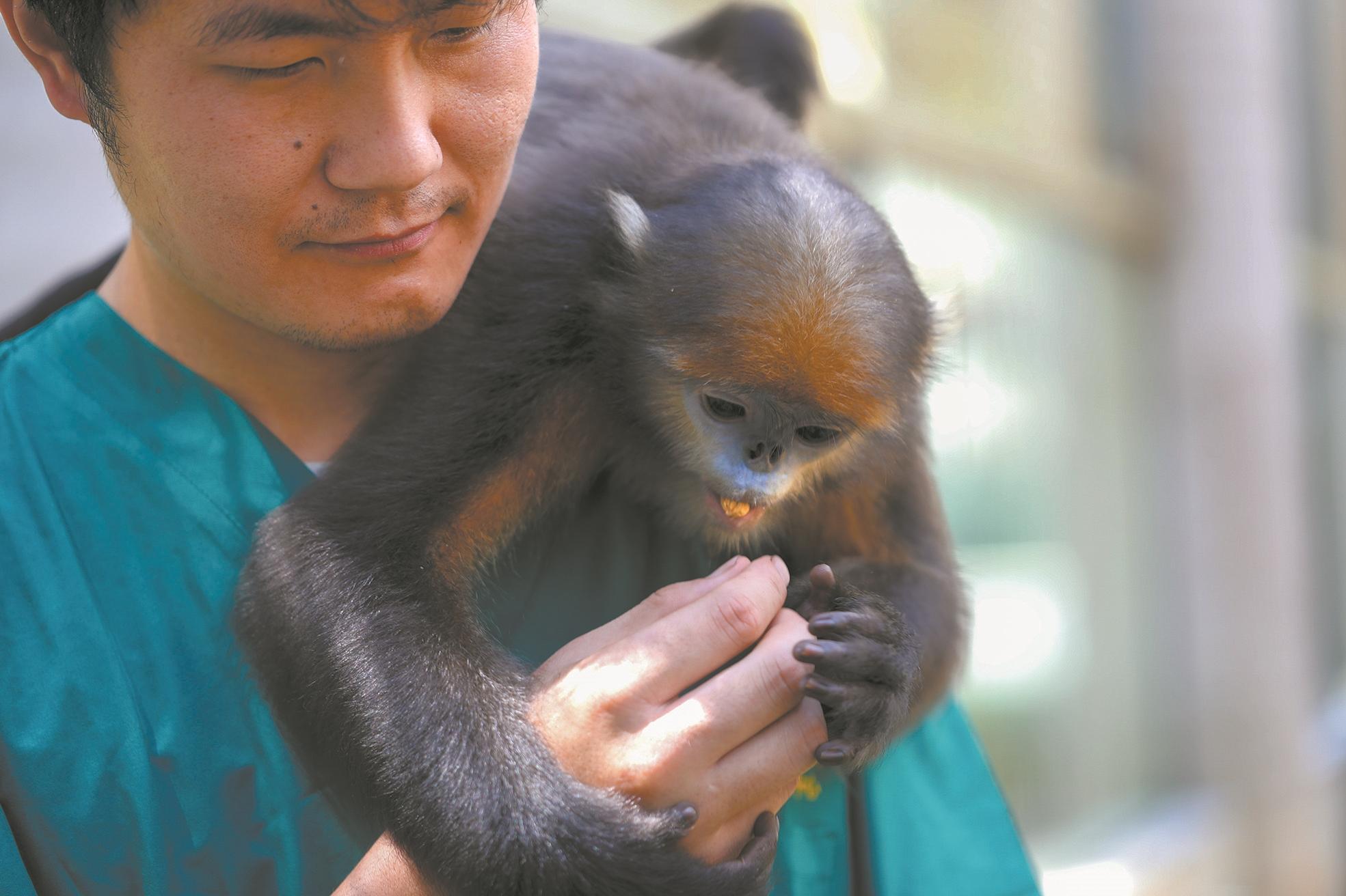 世居于贵州梵净山,脸部灰白或浅蓝、鼻眉脊浅蓝、吻鼻部略向下凹的黔金丝猴,其数量仅有850只左右。科研人员通过人工繁育另辟蹊径,人工繁育种群从1个家庭增加到2个家庭,数量从3只增加到8只,幼猴成活率达100%。