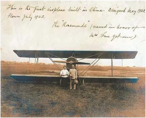不久,第一架飞机研制成功。宋庆龄在照片上用英文简介了照片内容:“这是中国制造的第一架飞机,1923年5月出厂,1923年7月试飞,‘乐士文’号以孙逸仙夫人名字命名。” [“This is the first airplane built in China. Designed May 1923. Flown July 1923. The‘Rosamonde’(named in honor of Mrs Sun yat-sen)”]1923年8月9日,孙中山偕宋庆龄至广州大沙头航空局,参加“乐士文”一号机命名典礼,并主持该机及其他新购10余架飞机的开驶礼。宋庆龄行开驶礼后,由飞行员分架各机,表演飞行。