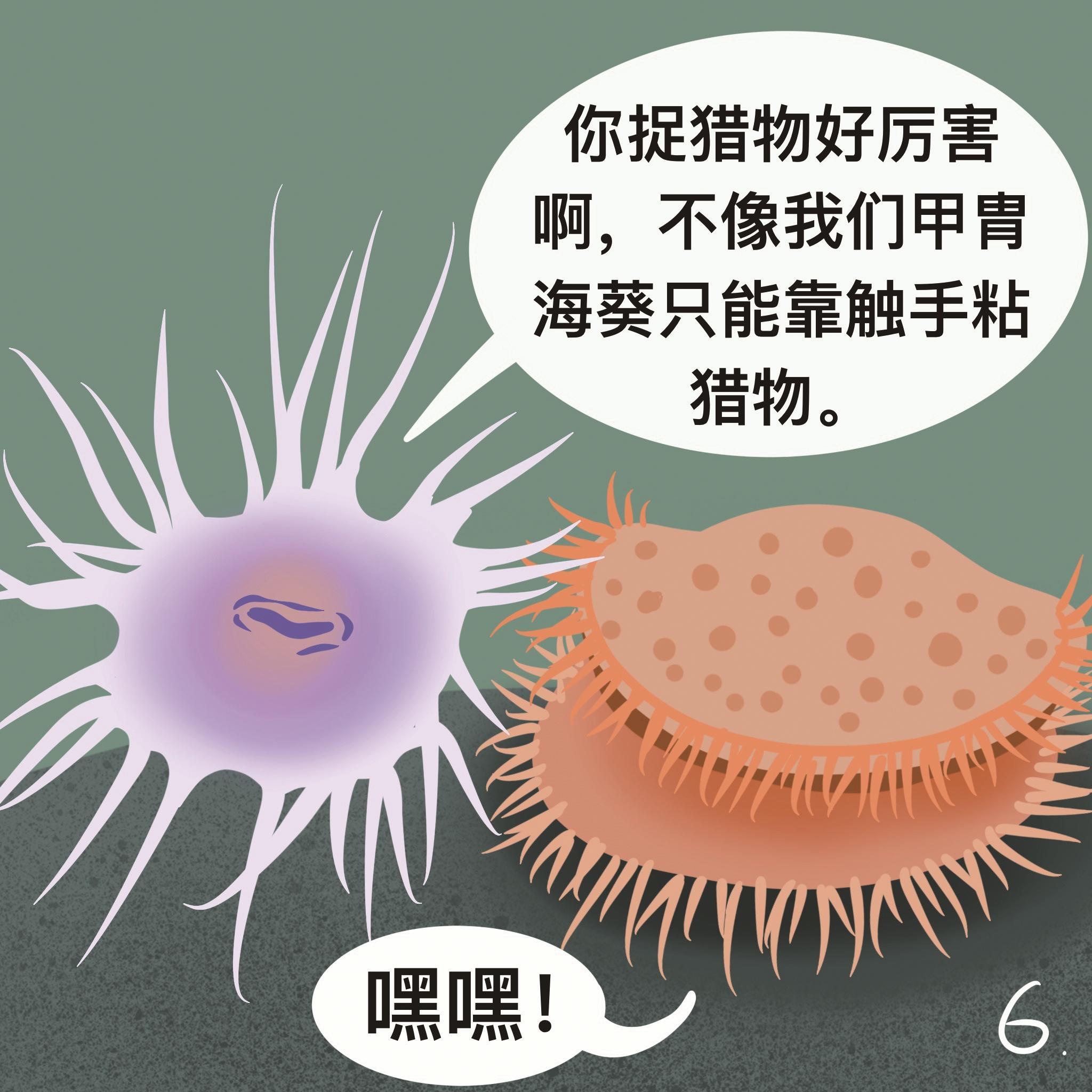 捕蝇草海葵以虾、蟹、小鱼等动物为食,它的捕食系统精妙又高效:首先会用基盘固着在海底,再把长有数十根触手的口盘朝向水流。当猎物接近时,柔软的口盘能瞬间从中间弯折,形成封闭牢笼。其触手上的刺细胞随即注入毒液,待猎物被麻痹后,再通过中央的口部缓慢享用这份“美食”。