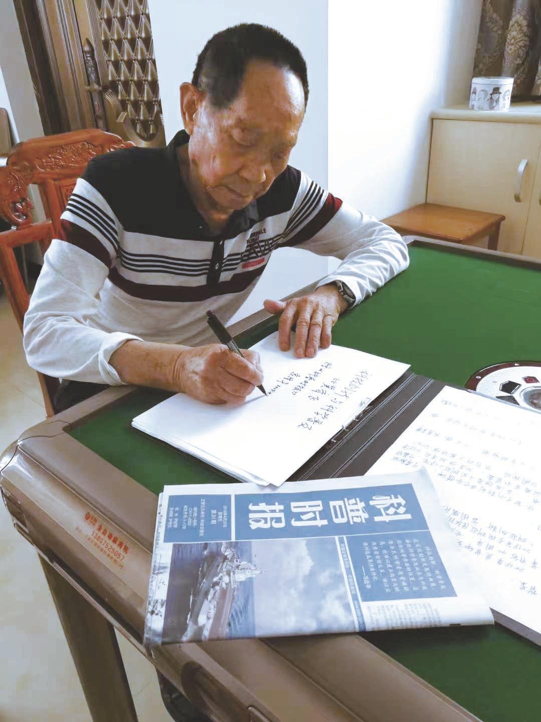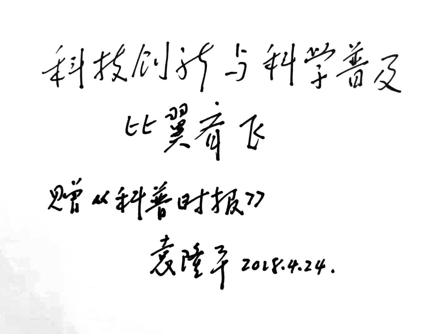 我请袁老为《科普时报》写几个字,他欣然应允,即从沙发上起身,来到旁屋一张麻将桌前,一板一眼地写道:“科技创新与科学普及比翼齐飞 赠《科普时报》”,并签上了自己的名字。