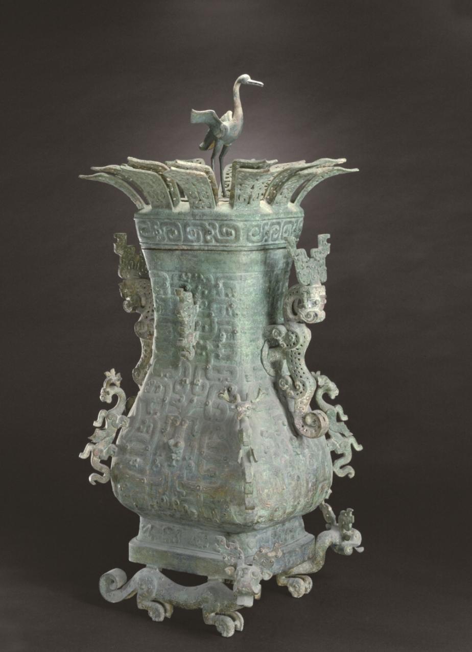 这只壶形体巨大,纹饰新颖。盖冠是双层镂空的莲花瓣,盖纽上立着一只昂头展翅的仙鹤。壶身四面饰有盘绕的龙纹,气派十足,腹部四个角上各有一条飞龙。底部两只伏虎稳稳托起壶身。这只壶既有中原文化的厚重,又有楚地器物的飘逸风韵,因造型精美,它被誉为“青铜时代的绝唱”。