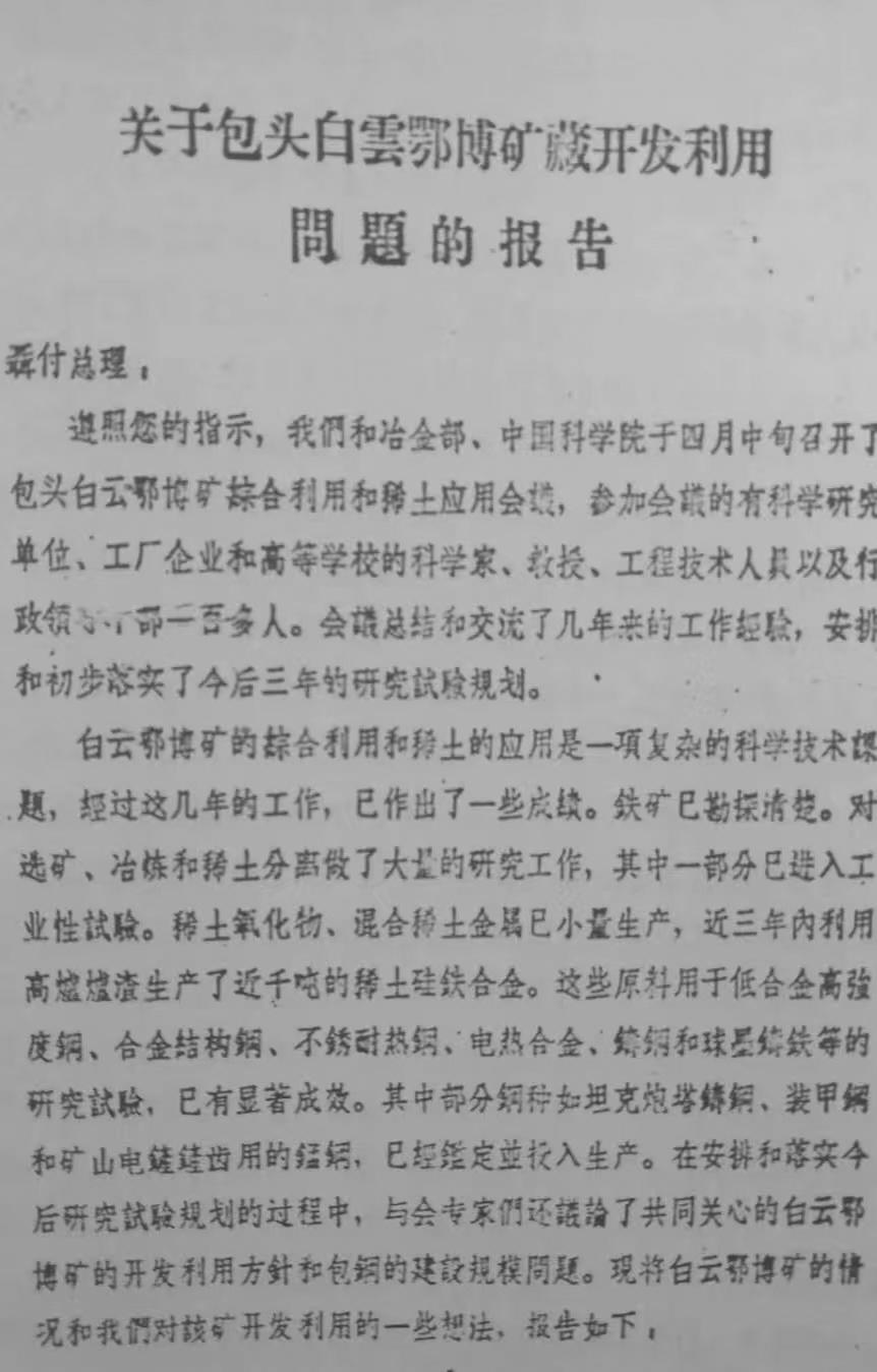 1962年,叶渚沛再次奔赴包头,对尾矿库进行了为期两个月的实地调研,撰写了长达数万字的《关于包头白云鄂博矿藏开发利用问题的报告》。他首次提出了“以稀土定产量”的颠覆性理念——即根据稀土提取技术的成熟度,来确定铁矿石的开采规模,建议整合地质、冶金、化工等领域的力量,攻关稀土提取技术,暂缓开发高稀土含量的矿区,将其作为战略储备资源保护起来。