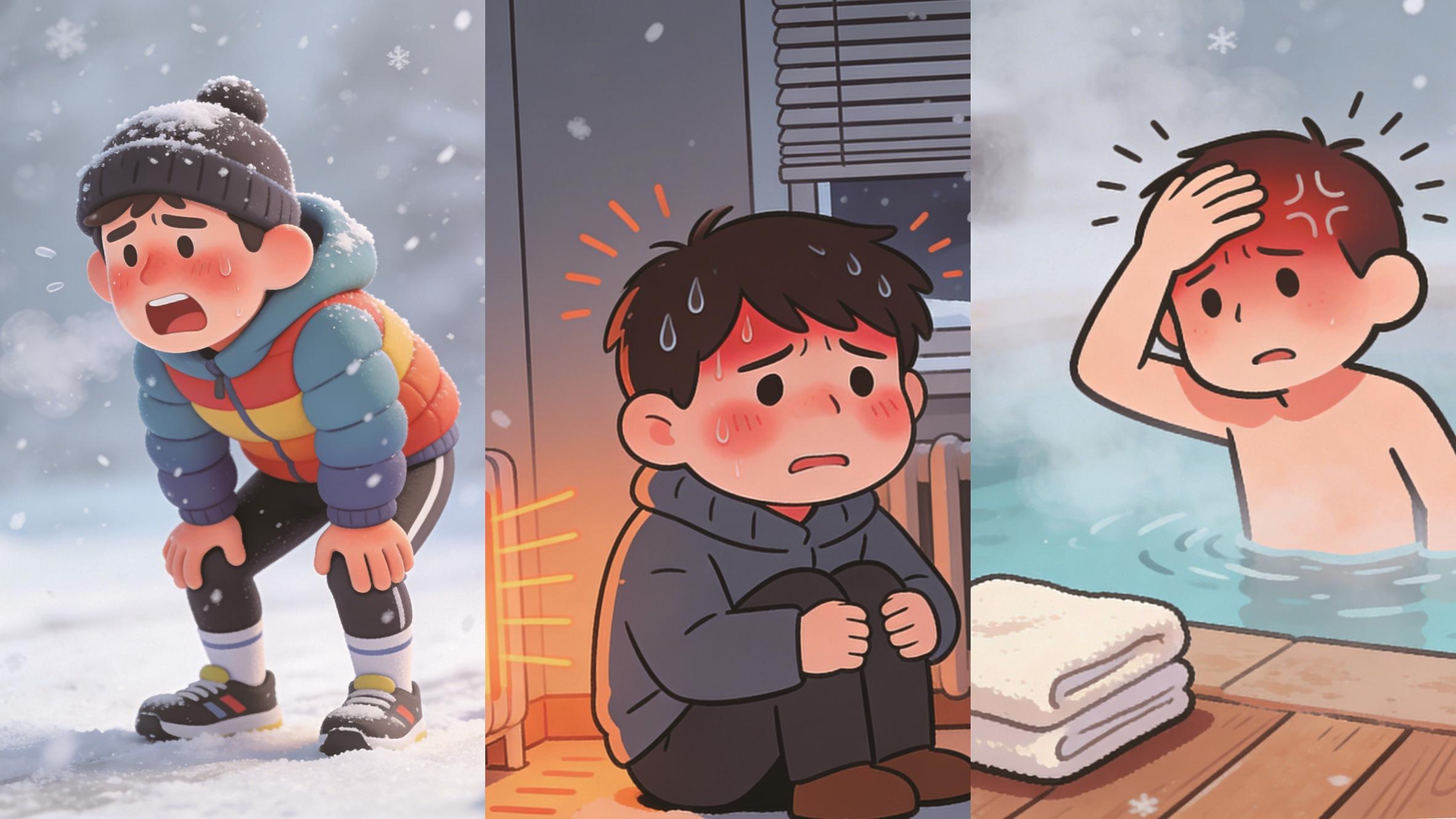 虽然冬季气温低,但在一些特殊情况下,仍然可能触发这一危险过程:一是长时间待在密闭、高温高湿的室内环境,比如过度供暖的房间、桑拿房或温泉池;二是进行高强度体力活动,如冬季军事训练、马拉松冬训、健身房剧烈运动等。