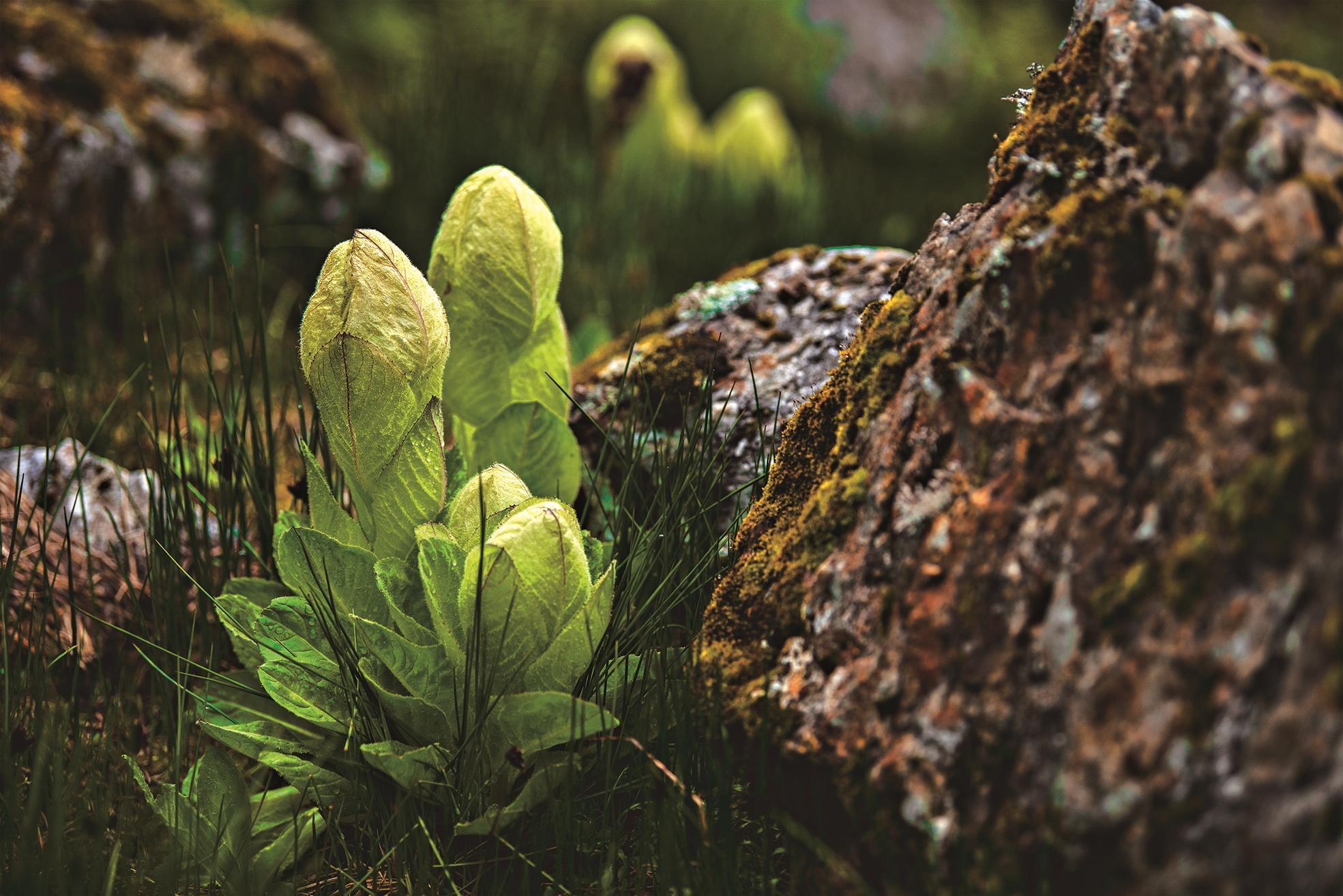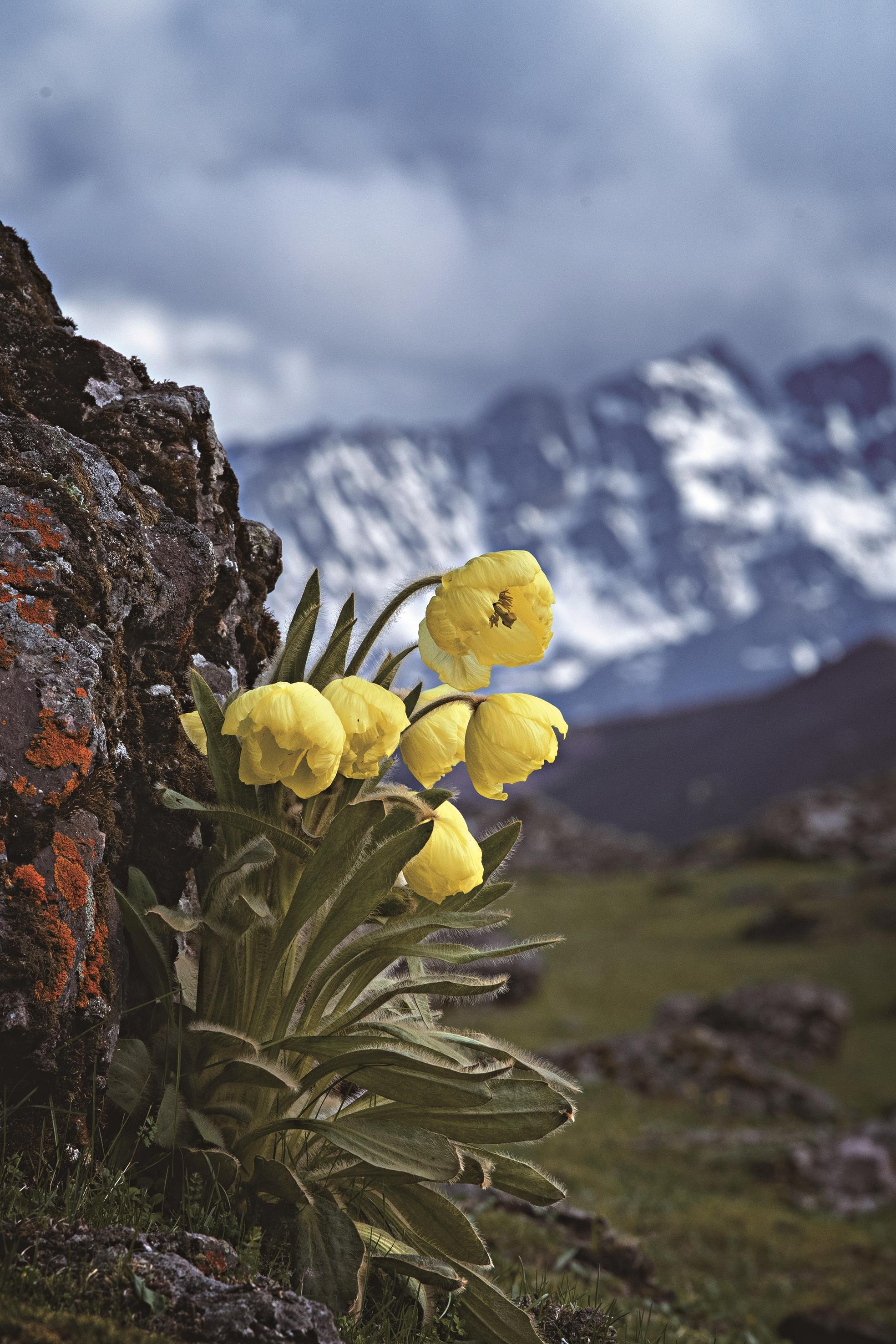 在青藏高原、横断山脉、祁连山、天山等地生长着多种珍稀植物,它们多扎根于海拔3000米以上的流石滩和高山草甸。那里,多风多雪、紫外线强、昼夜温差大、土壤浅薄且贫瘠。在如此苛刻的条件下,它们演化出一套独特的生存智慧:植株低矮贴地以抵御强风;苞叶围护,减少强烈日照的伤害;叶片覆盖蜡质或绒毛,既能锁住水分又可御寒……