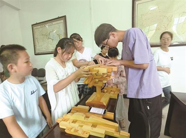 学生们在兰州市地震博物馆内进行斗拱构件模型的拼接。