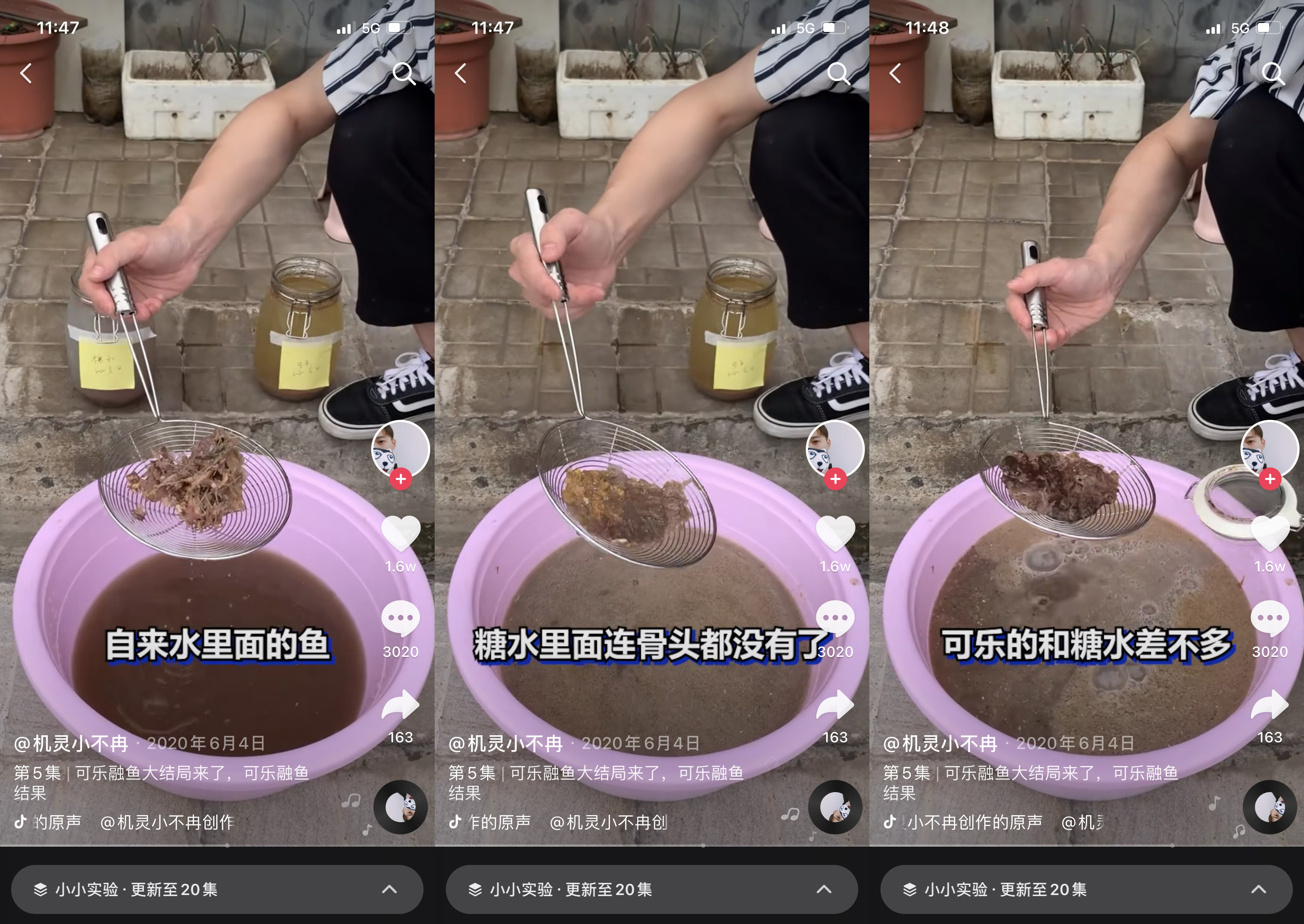 创作者“机灵小不冉”历时一个月创作的“可乐溶解鱼不能喝”系列辟谣视频在抖音上获得了超过60万点赞。“可乐溶解鱼不能喝”谣言源自国外的一条视频,视频作者将一条死鱼放进装满可乐的罐中,30天后开盖发现鱼只剩下一些残渣,因此认为可乐连鱼都能溶解,对人的胃会有伤害,会很危险,不能喝。