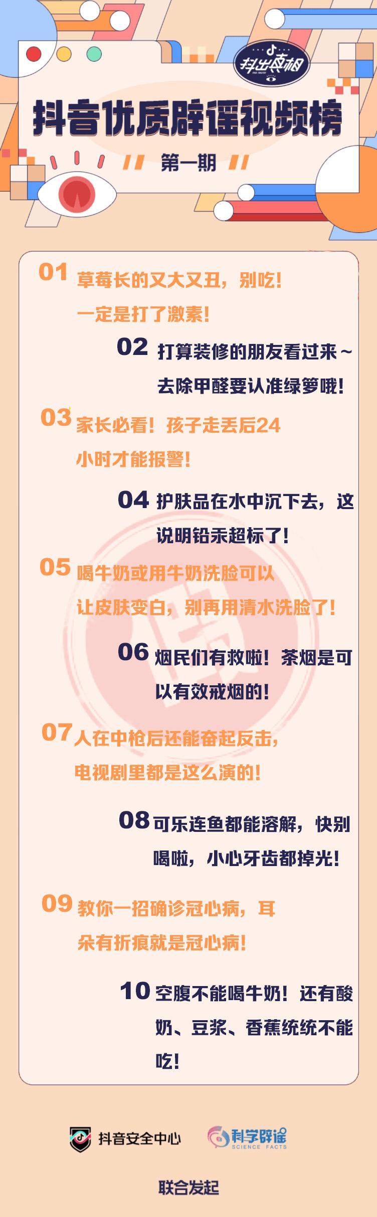 “优质辟谣视频榜单”的推出,是为了净化抖音平台内容,更好地发挥平台科普与辟谣的作用,并帮助媒体及优秀个人创作者参与科普与辟谣工作。在对平台上的科普与辟谣类视频作品进行梳理后,抖音邀请了多个行业的专业人员组成团队,从真实性、严谨度等多个角度对辟谣视频作品进行审核评估,最终推出抖音优质辟谣视频榜单。